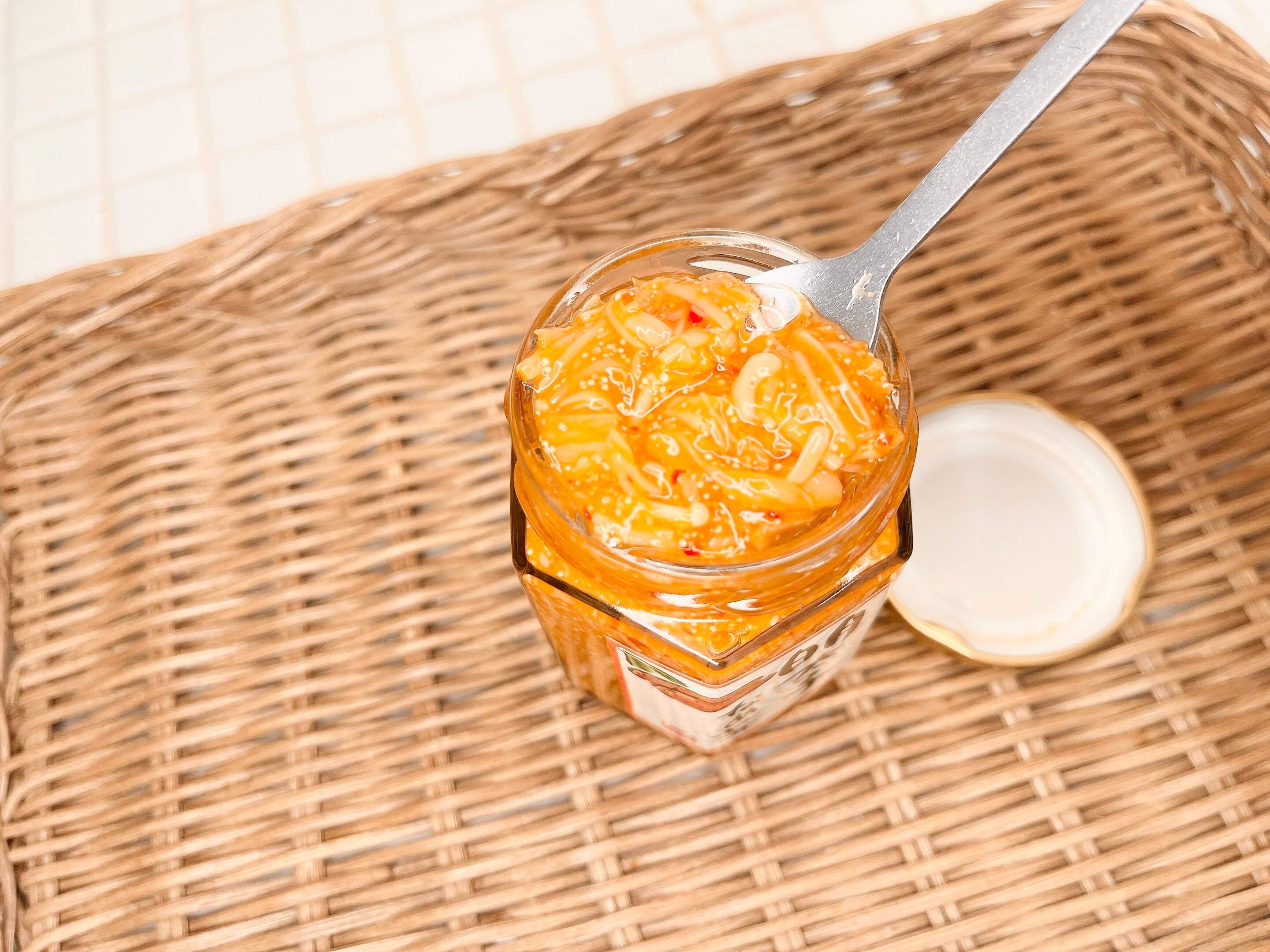 蓋を開けると、ニンニク風味な、甘じょっぱく酸味のあるキムチの様な香りが広がります。