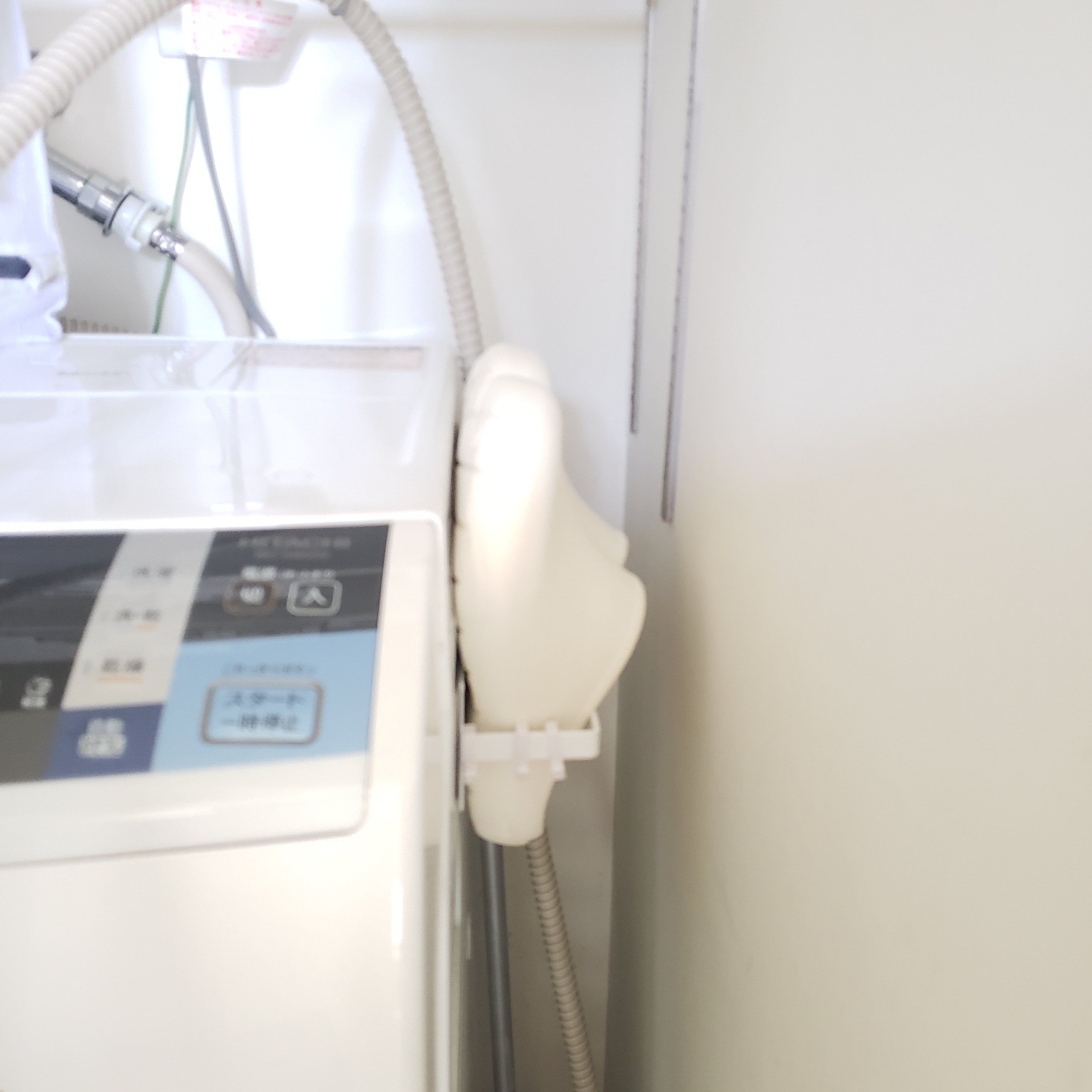 洗濯機の横の隙間を利用して浮かせて収納できます。フックも3つ付いているので便利です。