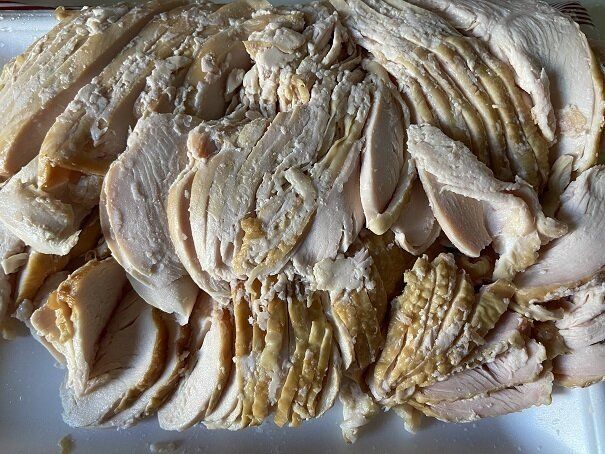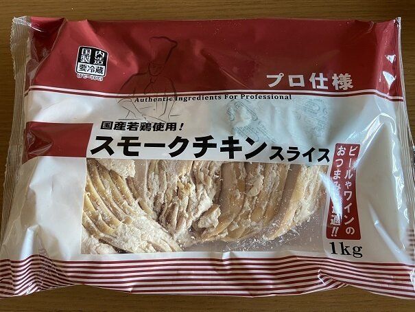 業務スーパーの隠れた人気商品!「スモークチキンスライス」(購入時:895円)はたっぷり1kg入りの大容量パックです。