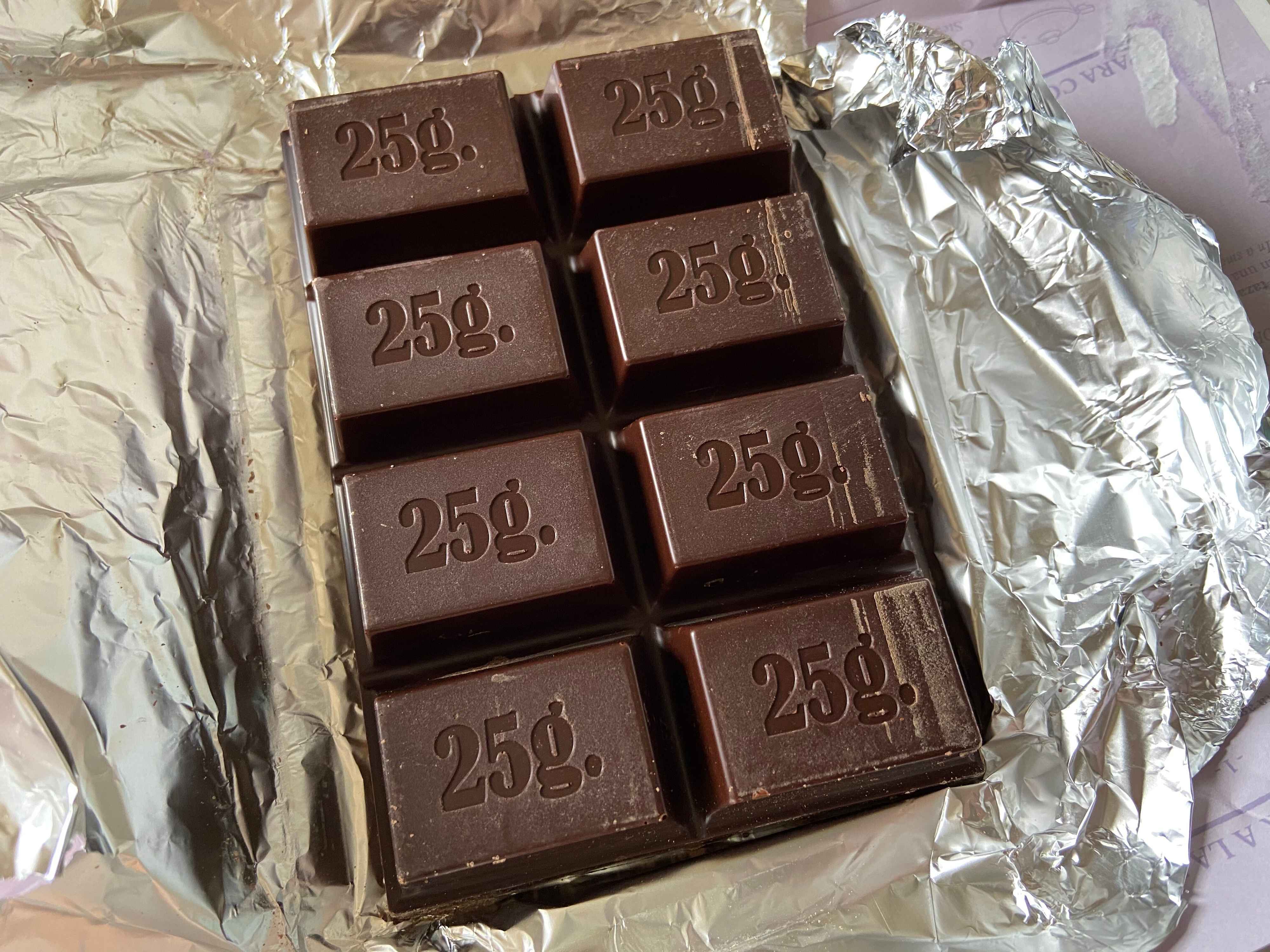 開封してまず目を引くのが、「25g」の文字。1ブロックの重さが一目瞭然です!一般的な板チョコに比べてかなり厚みがあり、ずっしりとしています。