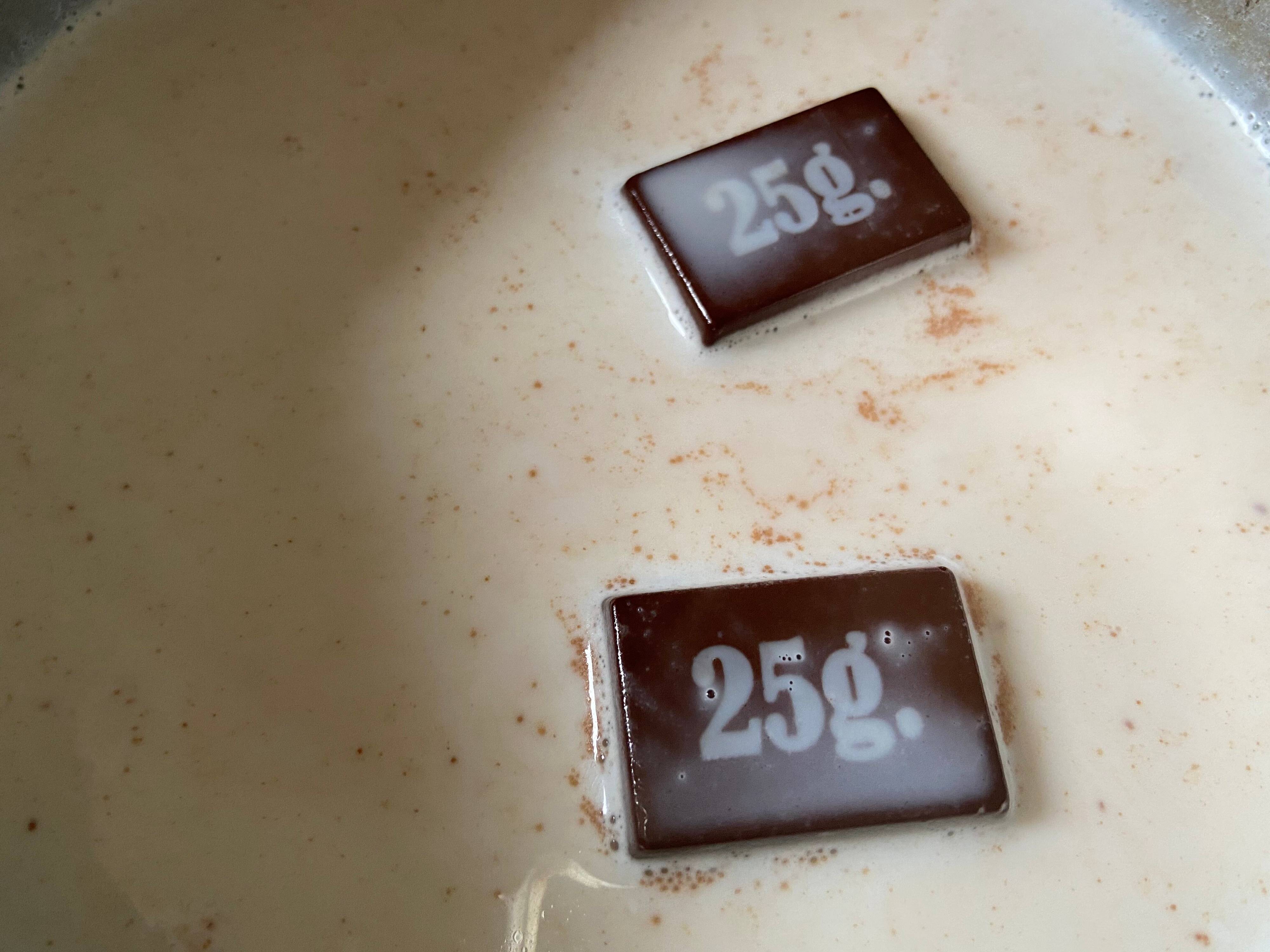 作り方は簡単、牛乳150ccとチョコを50g(2ブロック)入れてゆっくりコトコト煮ていきます。