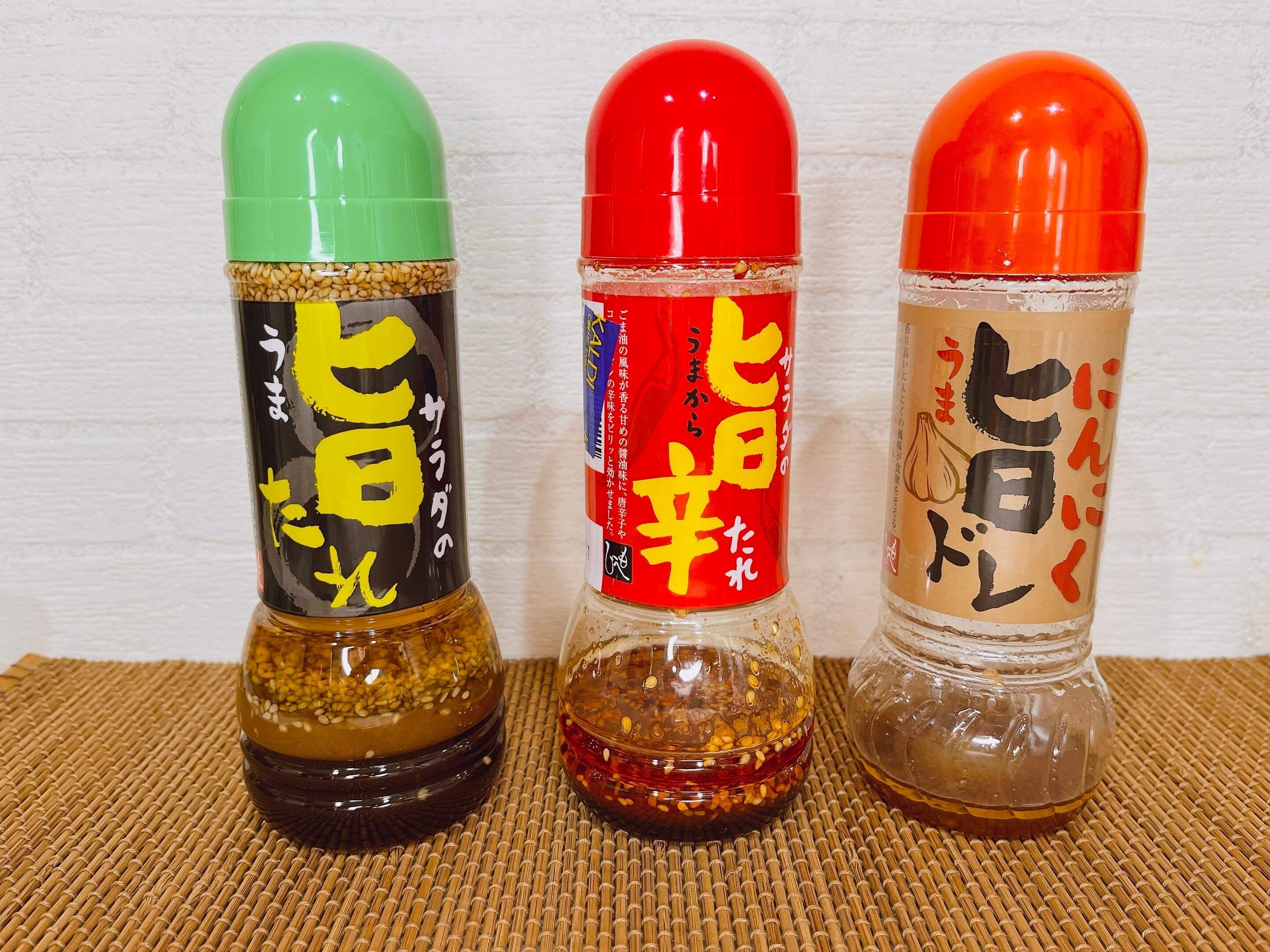 緑の蓋のノーマル旨たれは、ゴマの香りとにんにくの旨みが効いていて、サラダをおいしくしてくれます。