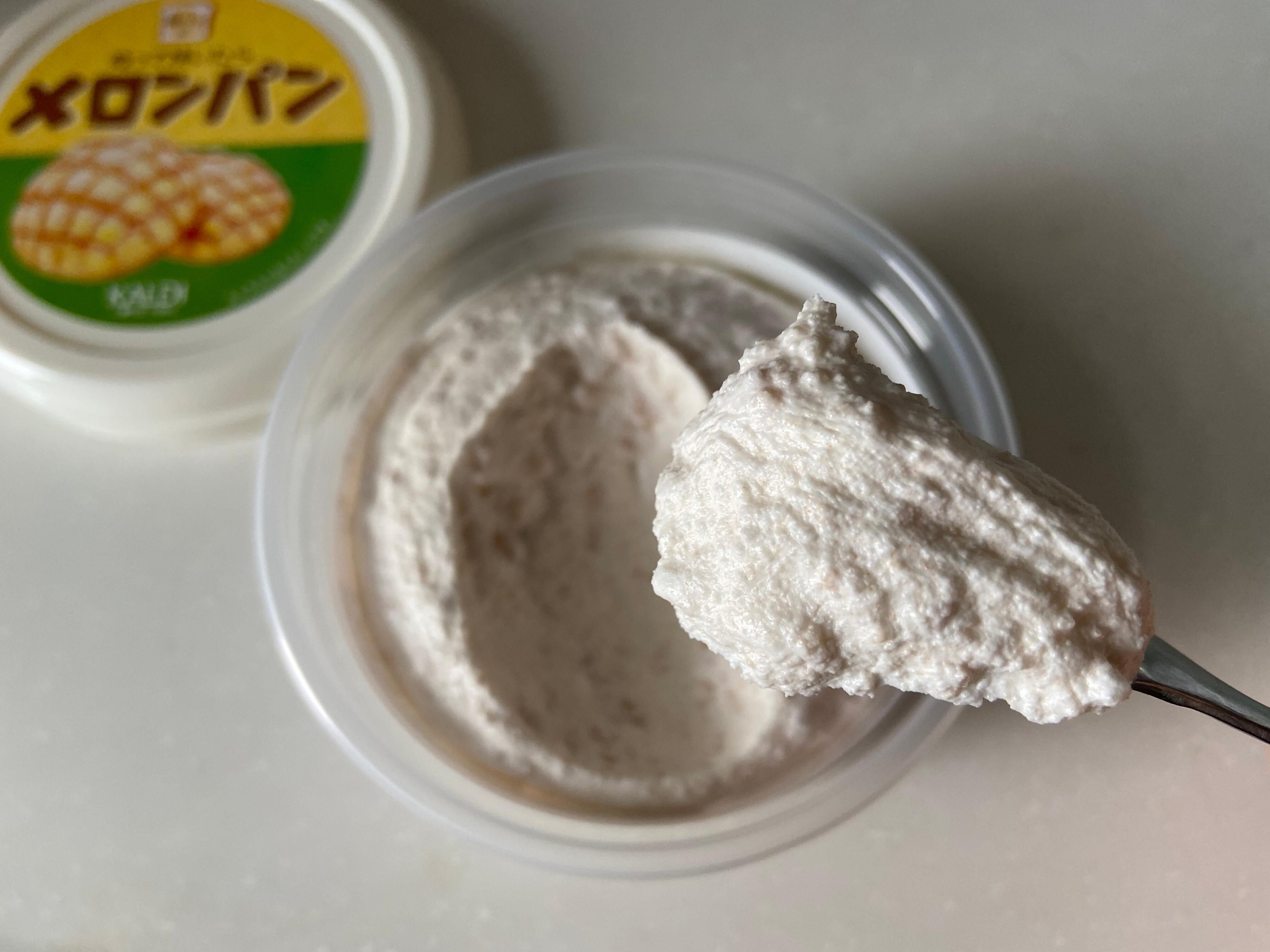 メロンジュースパウダーやクッキーが入っていて、スプーンを入れるとソフトで柔らかくとっても塗りやすいスプレッドです。
