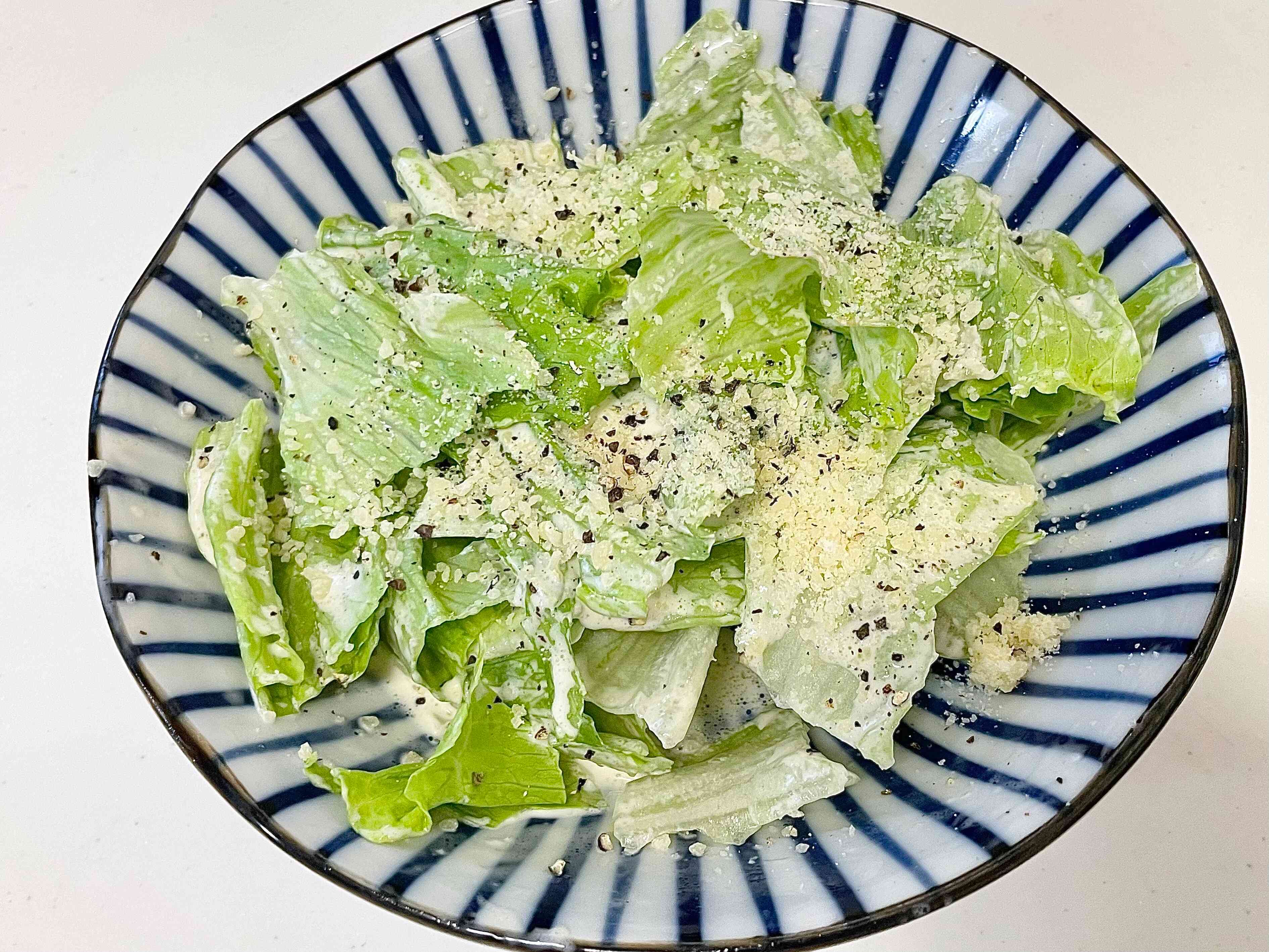 今回はシーザードレッシングを作り、粉チーズをかけました。