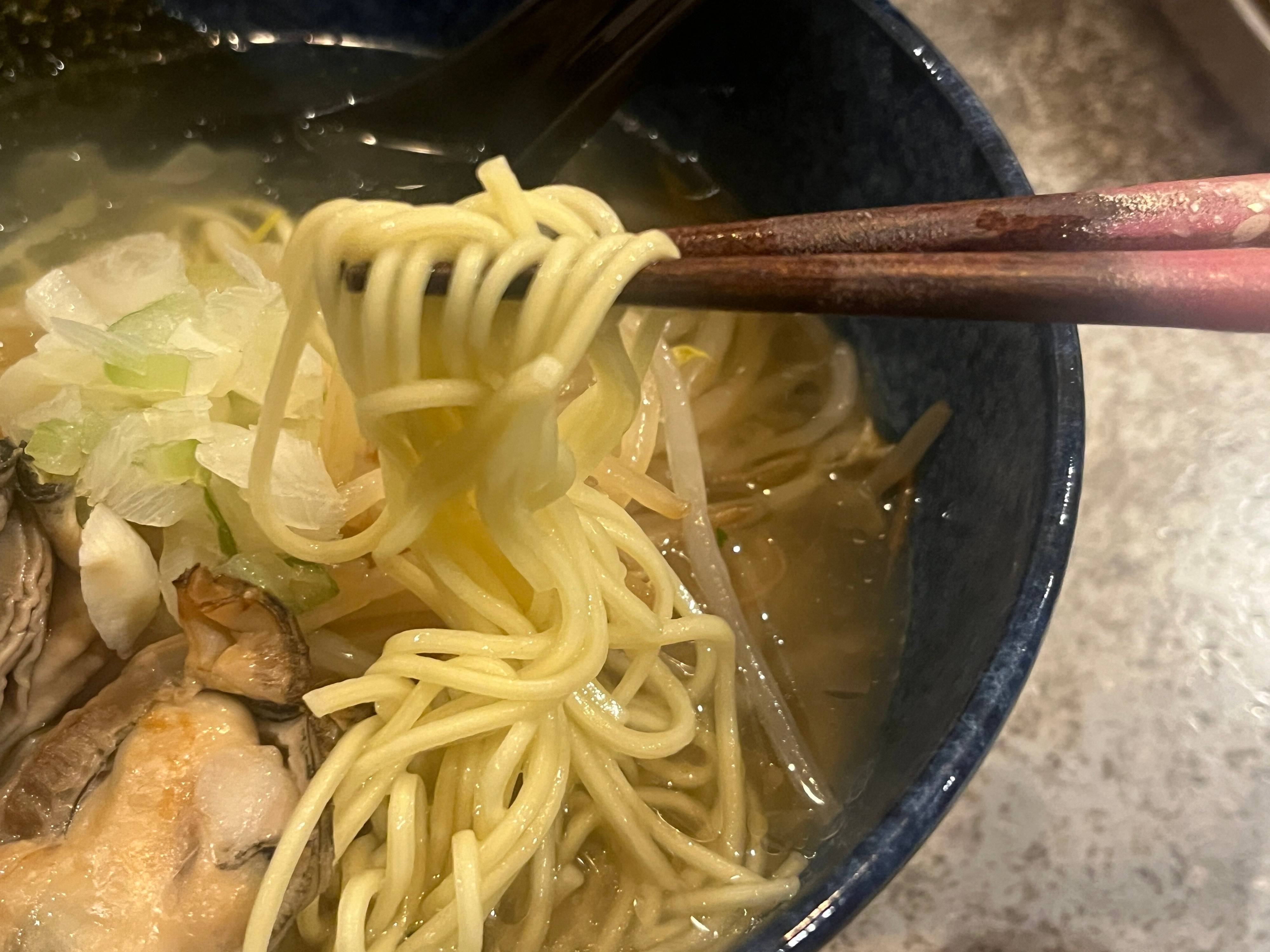 貝のだしが効いたあっさりした塩味のスープは、全部飲み干しても罪悪感がないくらいやさしい味。スープが絡みやすく、喉越しのよいストレートの細麺との相性も抜群です。