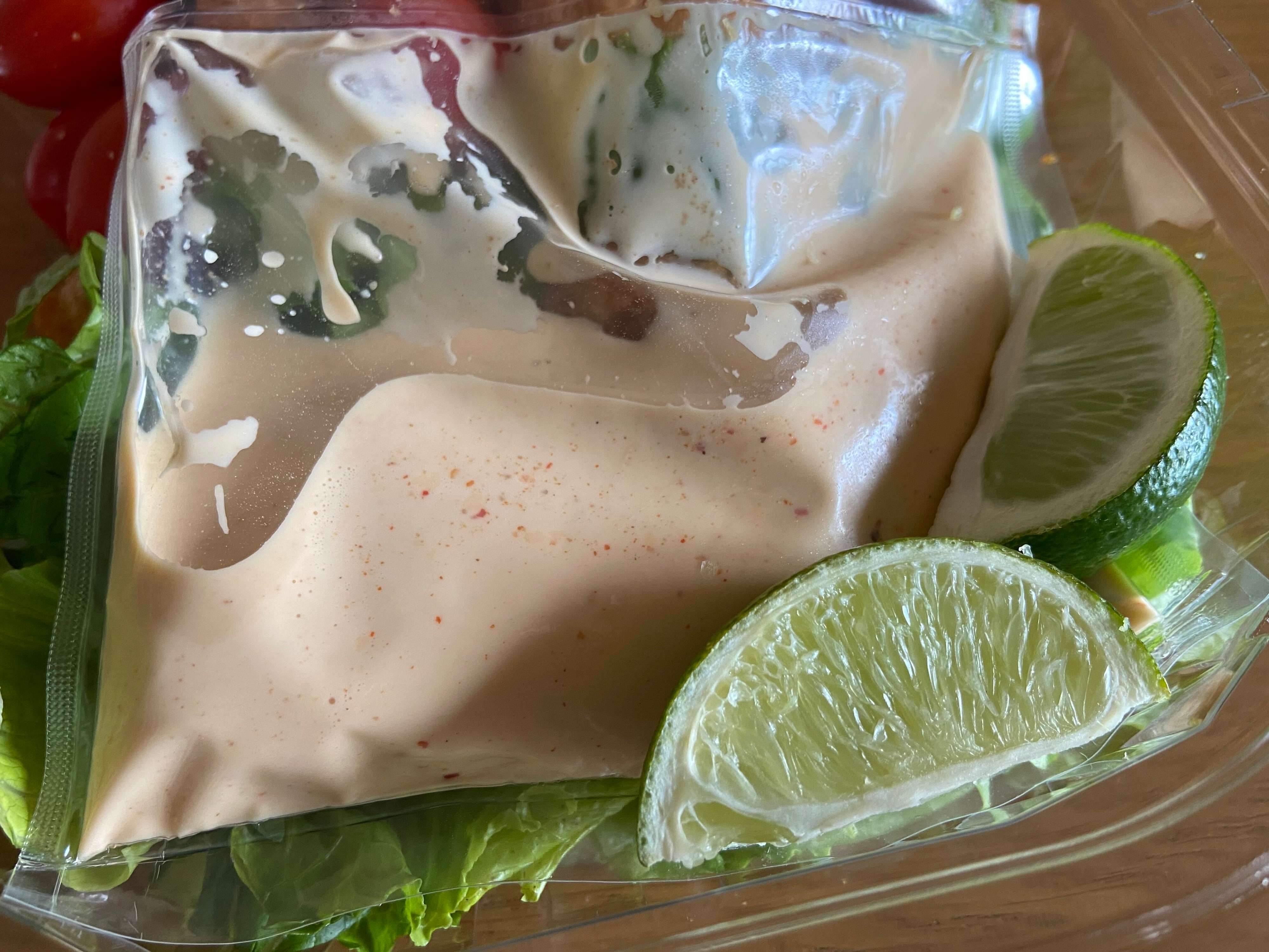 ブンブンの正体は別添えのドレッシング。アメリカ生まれのマヨネーズベースのピリ辛なソースのことだそう。コストコ版ブンブンソースは、「チーズとチポトレを使った特製ソース」と売り場に表記がありました。
