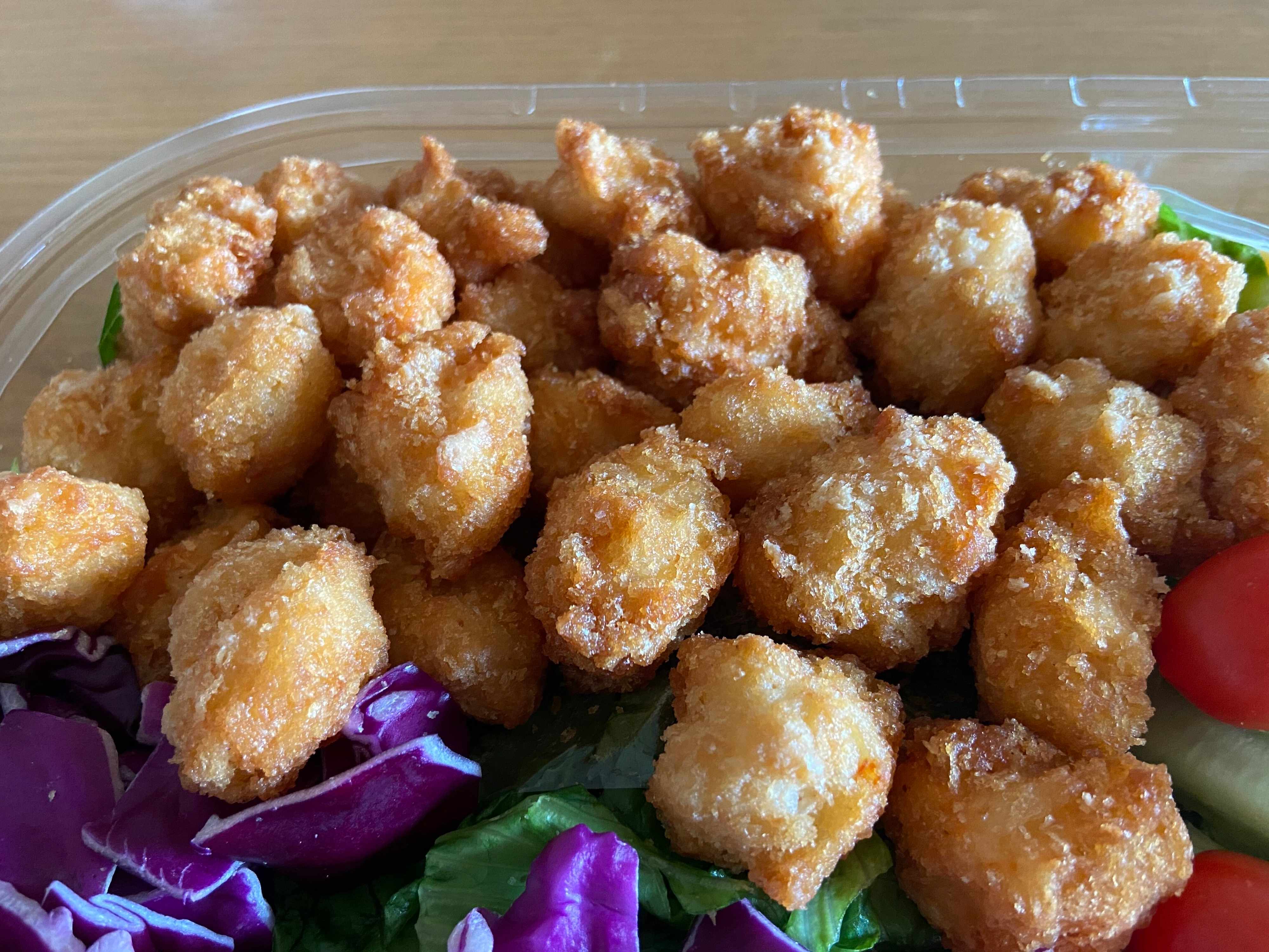 レタス、赤キャベツ、ミニトマトに、たっぷりの小海老のフライが入っていてボリューム満点サラダです。