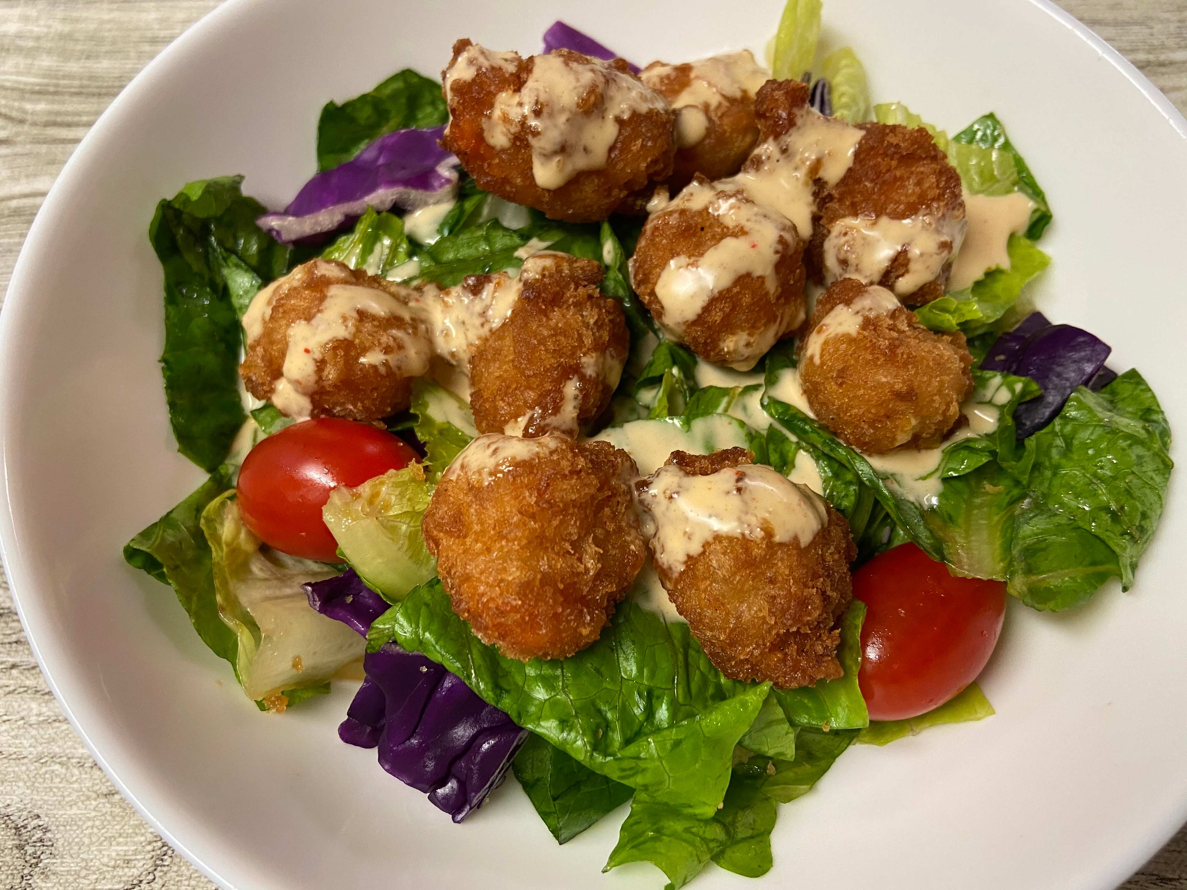 小海老のフライがたっぷりのって、おかずとサラダがいっしょになったようなボリュームのある一品!特製ドレッシングのブンブンソースが決め手のおいしいサラダでした。