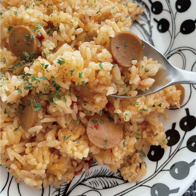 ジャンバラヤはソーセージ、マッシュルームコーンなどが入っており