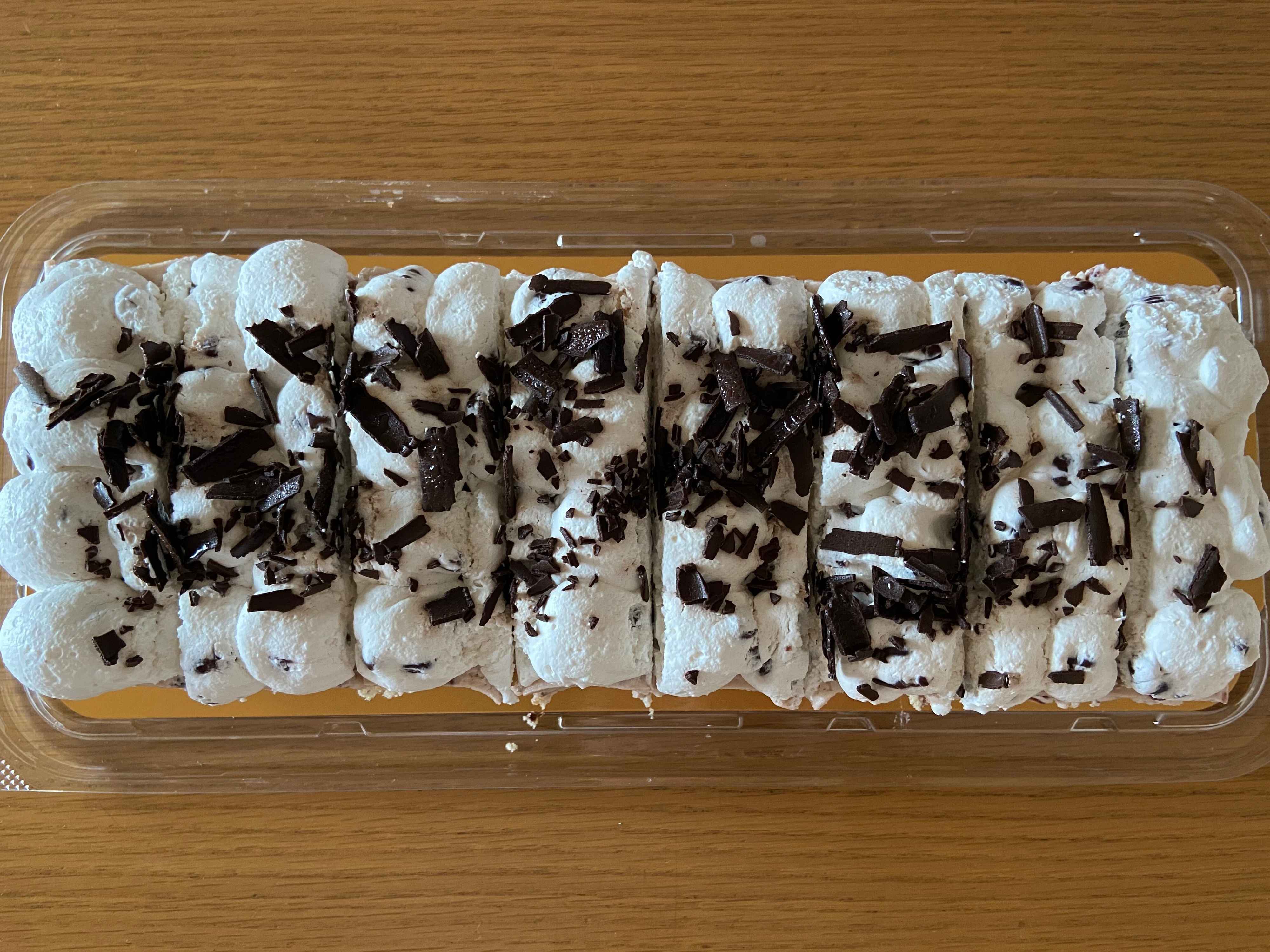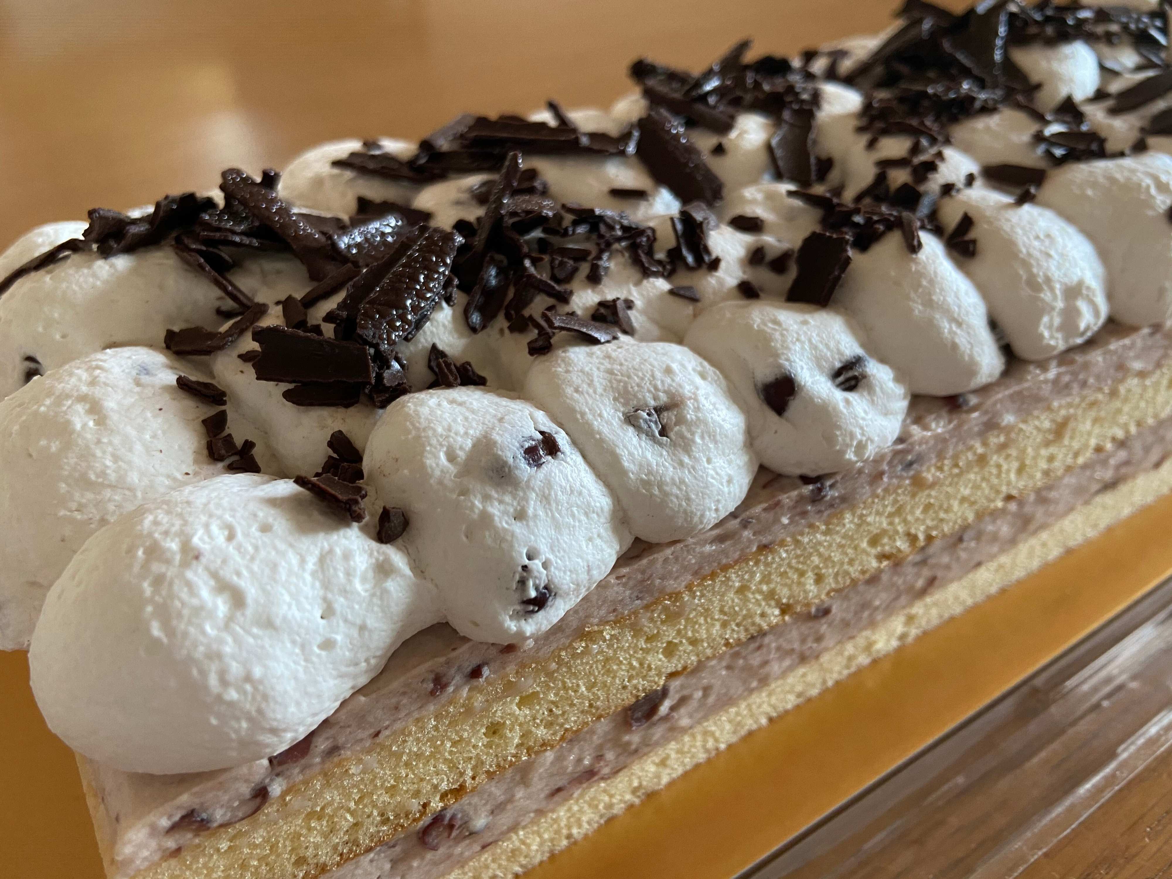 ずっしり重みのある1kg超えのバーケーキ!スポンジ生地とあずきクリームがきれいな層にないっています。トップにはたっぷりのホイップクリームにシェービングチョコ。