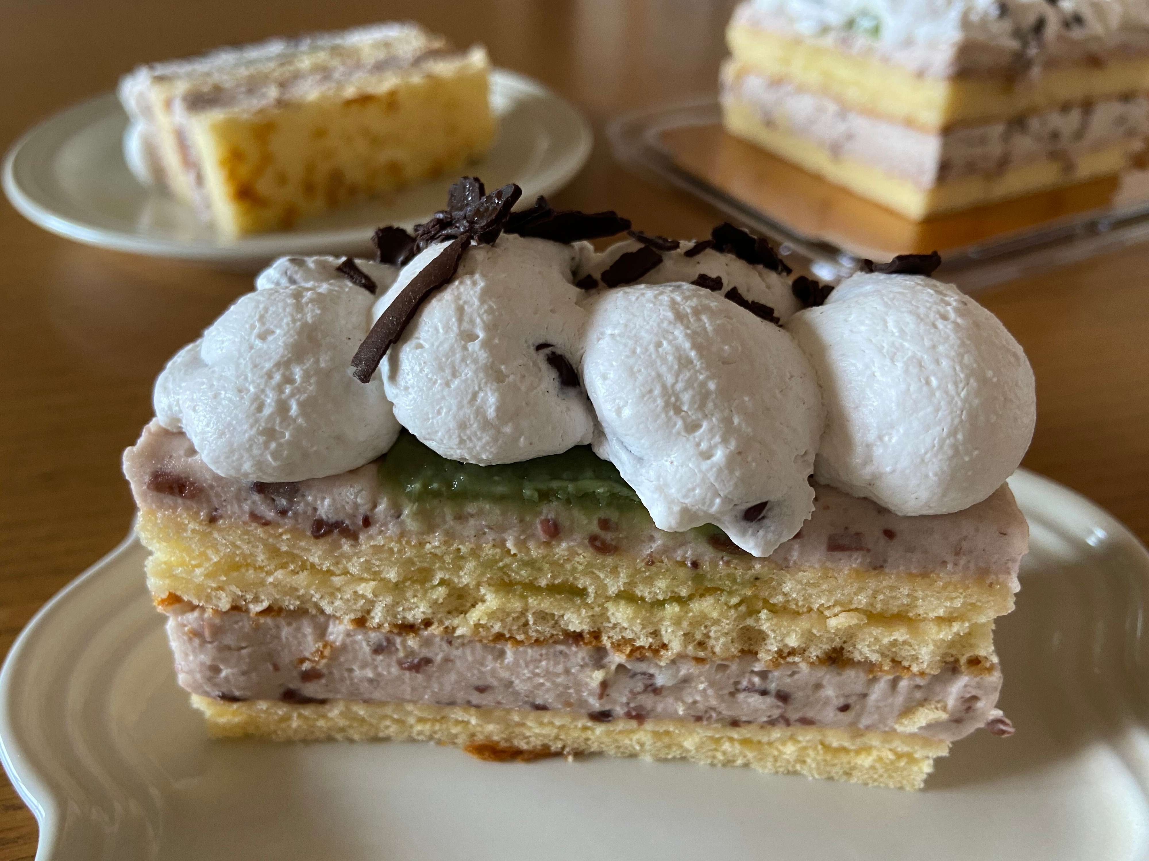 抹茶カスタードは量が少ないので主張は弱めですが、ほんのり抹茶味が感じられあずきクリームとの相性も抜群。上のホイップクリームにもしっかりあずきが入っていてリッチな味わい。ビターテイストのシェービングチョコで「洋」のアクセントがプラスされておしゃれなケーキに仕上がっています。