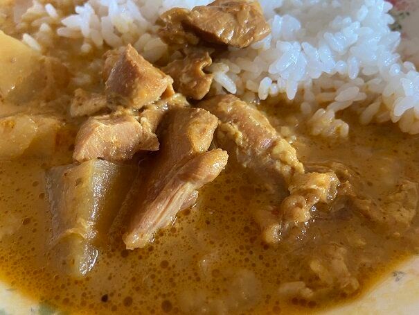 ココナッツミルクベースにさまざまなスパイスが効いて鶏肉やじゃがいもなど具材がゴロゴロ!辛いのが苦手な方でもおいしく食べられる控えめな辛さとクリーミーさで、リピート買いしているおいしいカレーです。