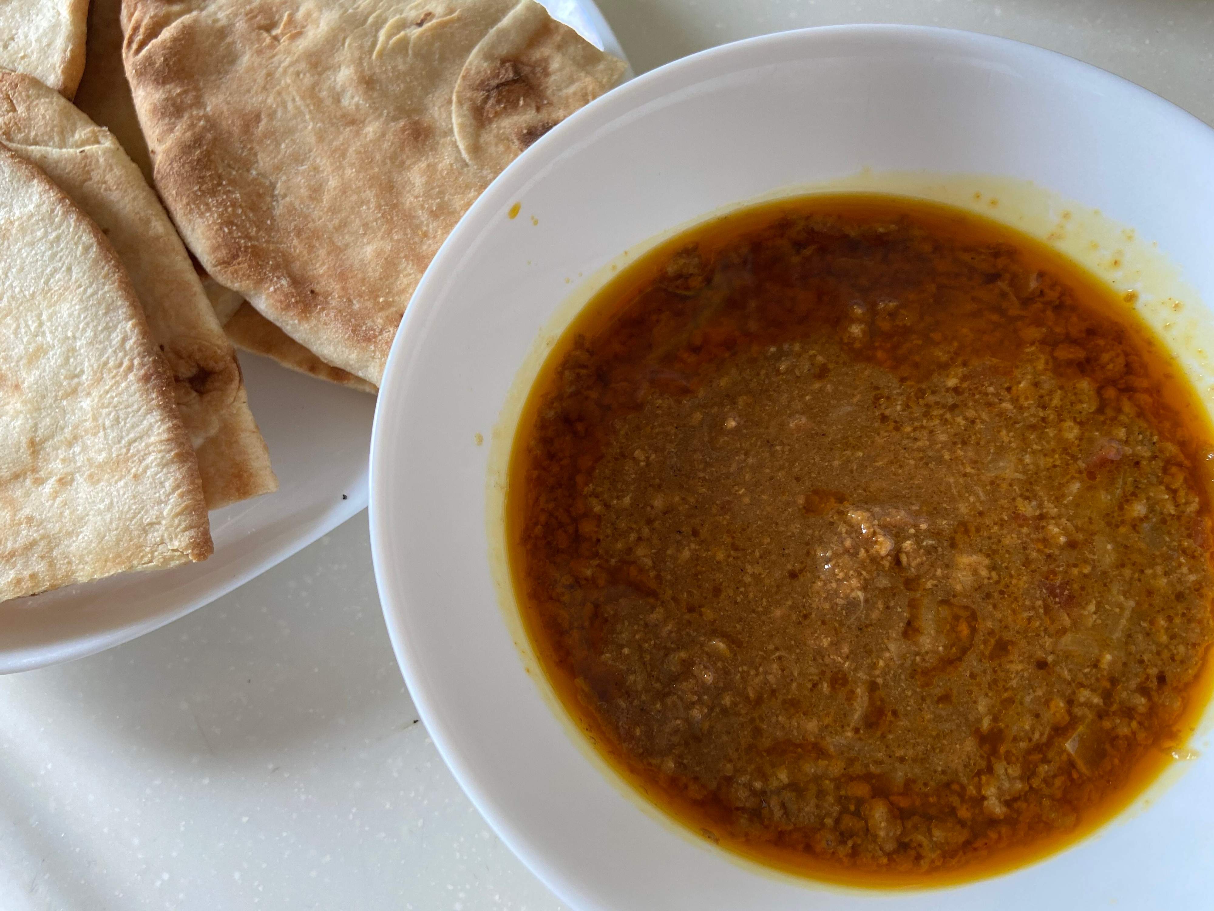 スープカレーのようにサラサラしているキーマカレーです。鶏ひき肉がたっぷり使われていて、スパイシー。しかしただ辛いだけではなくトマトや玉ねぎが溶け込んだ旨みとコクも
