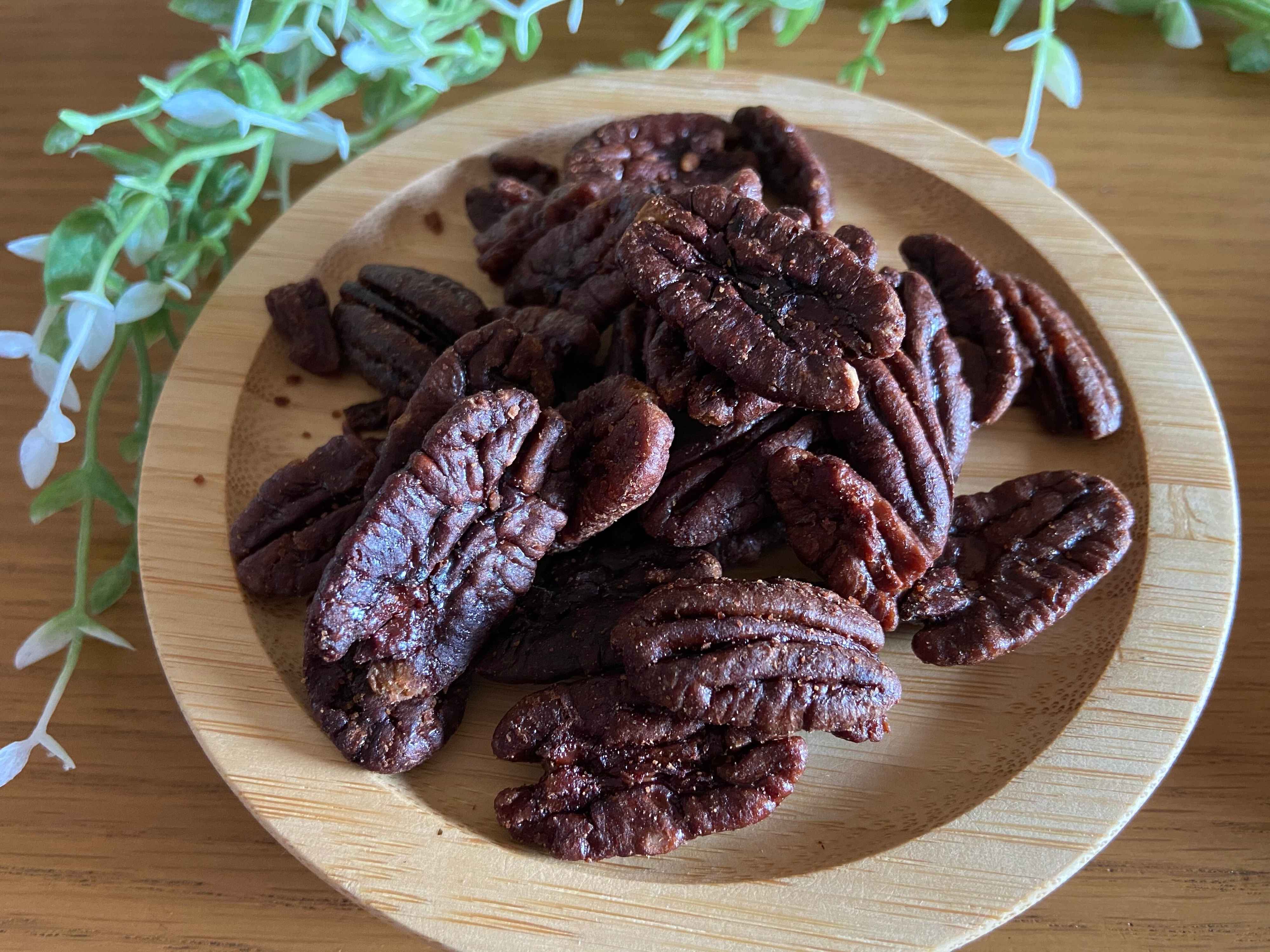 使用されているのは蜂蜜と砂糖ですが、不思議なことに黒糖のような深いコクのある甘みが感じられます。ピーカンナッツに染み込ませてじっくりローストしてあるので、表面がカリッカリになって香ばしい食感と風味。そこにじんわり広がる甘み。