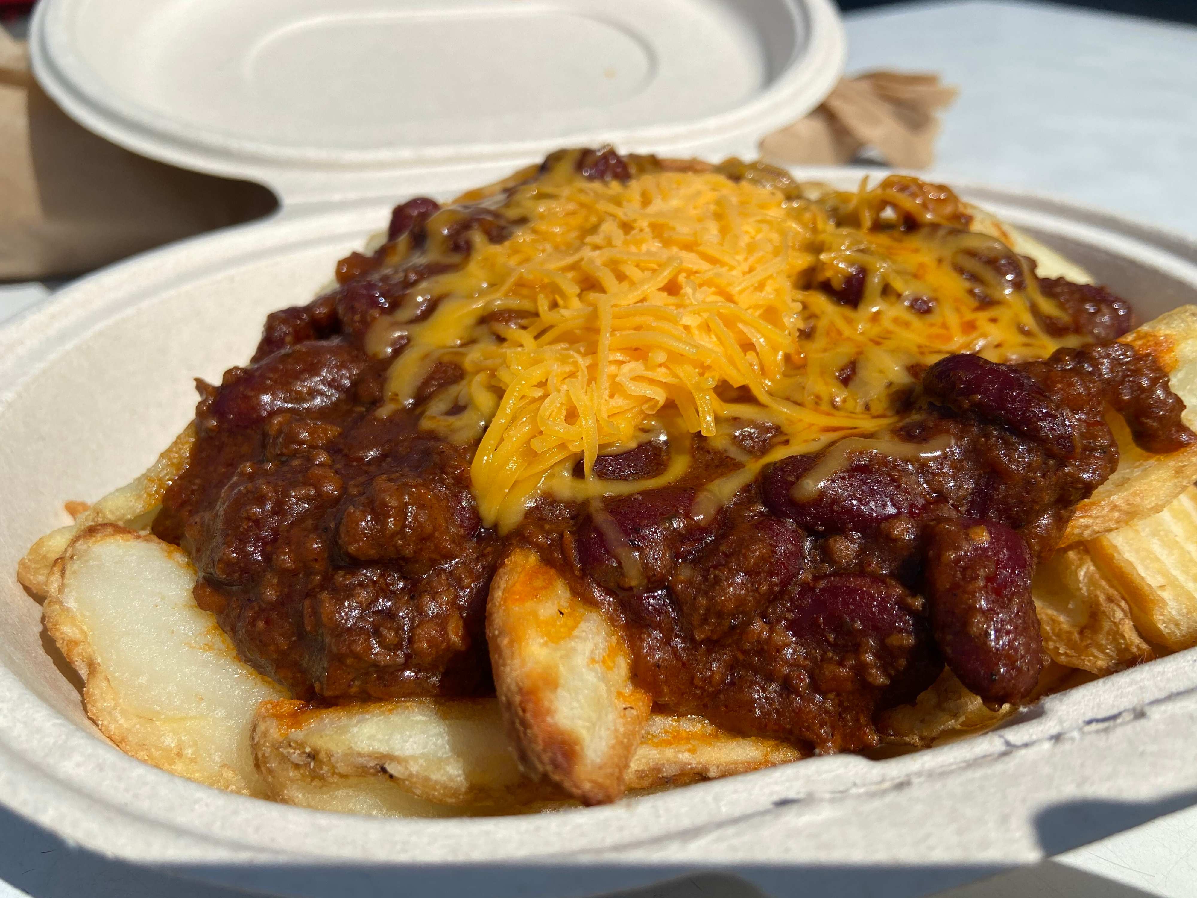 たっぷりのフライドポテトの上にチリビーンズとシュレッドチーズがのっています。