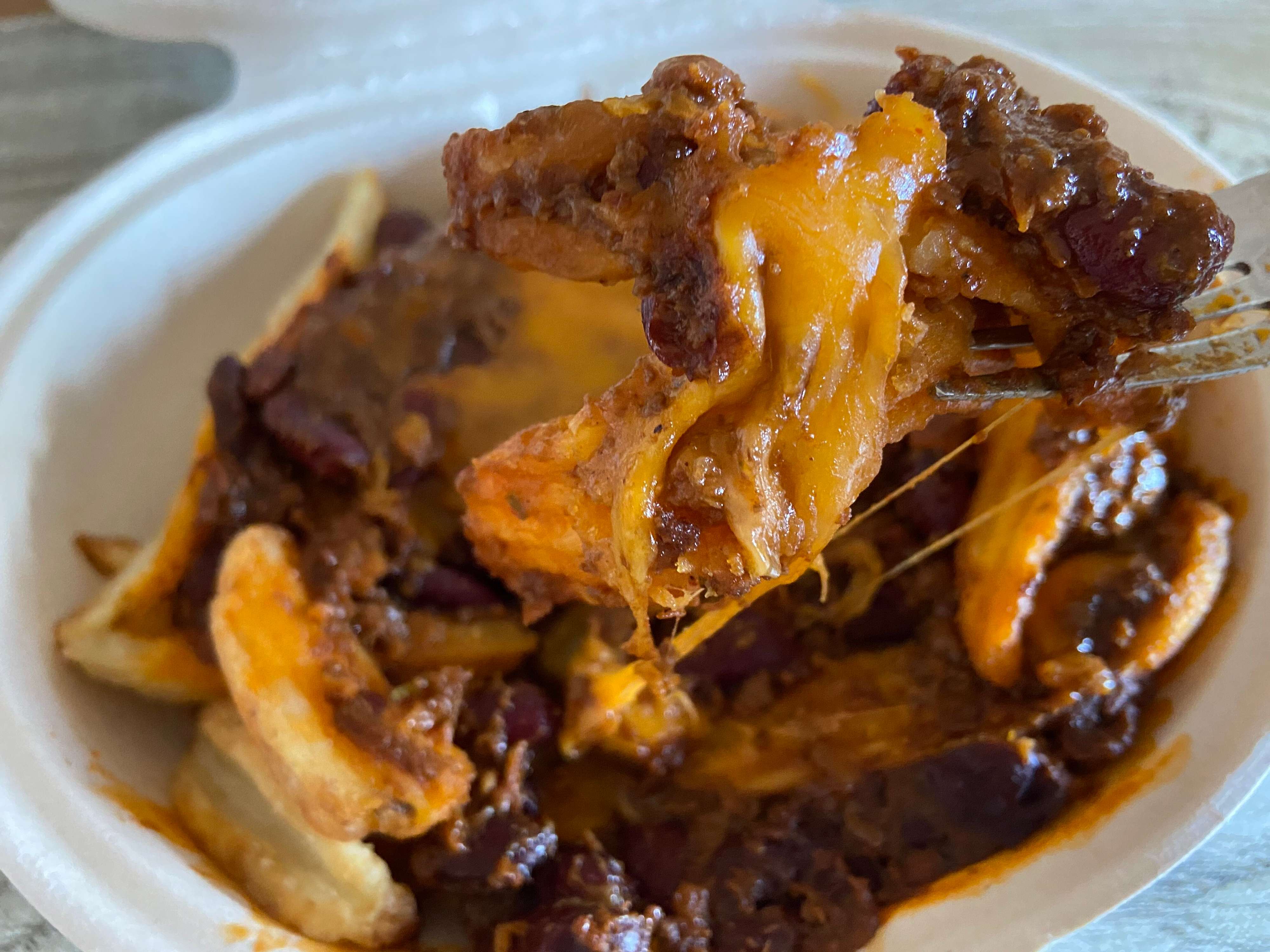 ほくほくのフライドポテトにピリ辛のチリビーンズがたっぷりからまって、とろけるチーズも濃厚で最高においしい!カロリーはきっと高いでしょう、でもそんなことはどうでもよくなるくらい……やみつきになるおいしさです!
