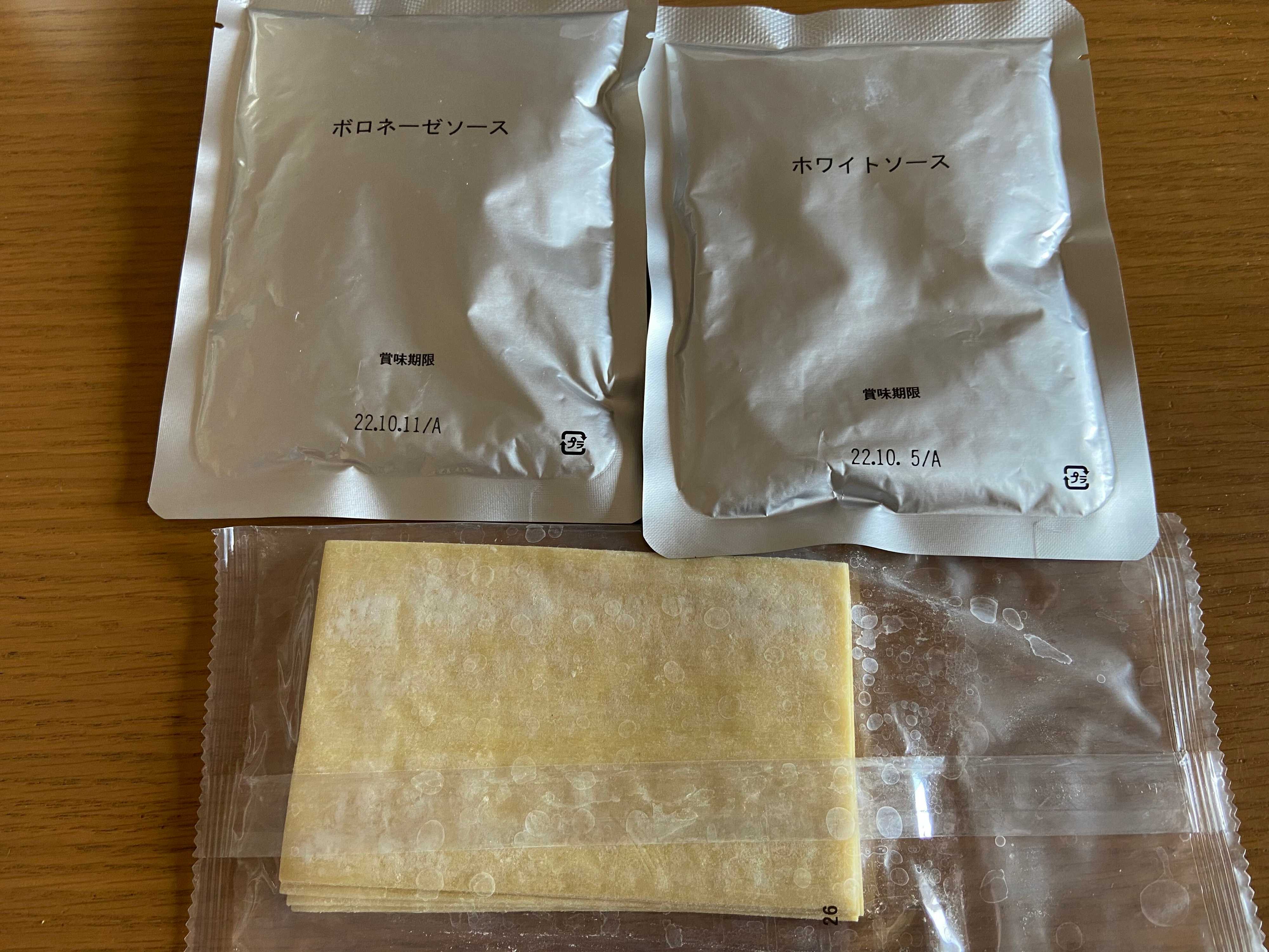中にはボロネーゼソース、ホワイトソース、ラザニア(シート状のパスタ)が入っています。