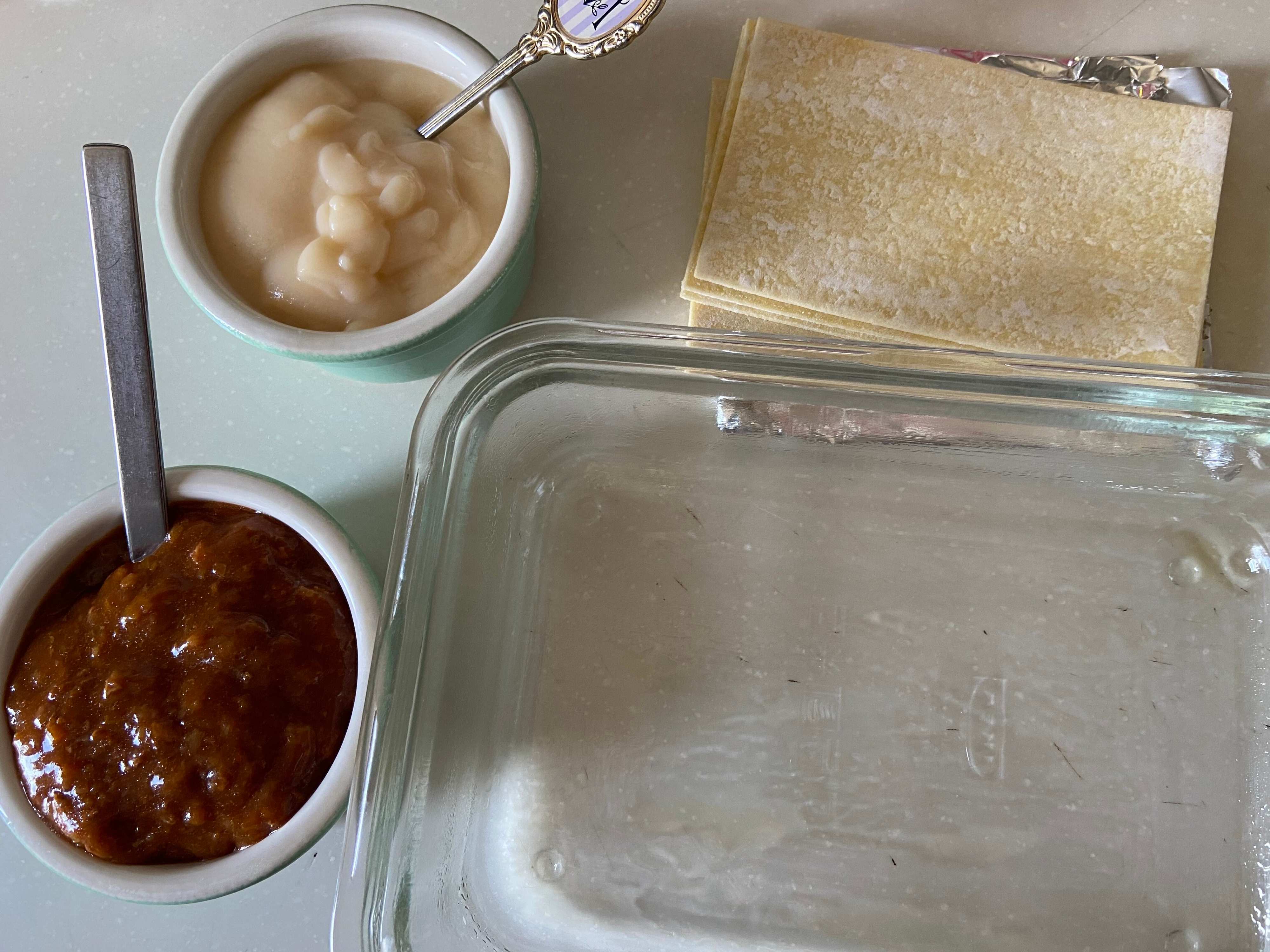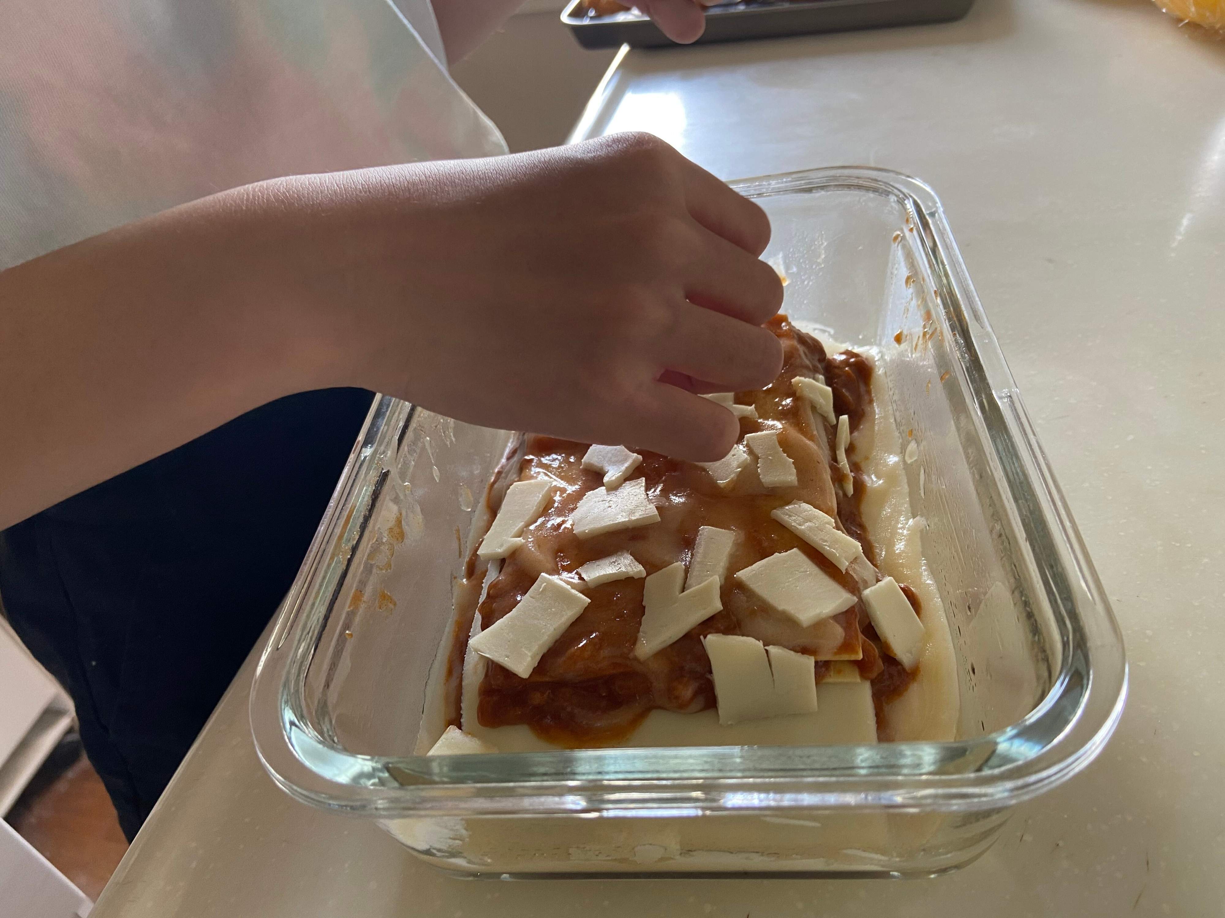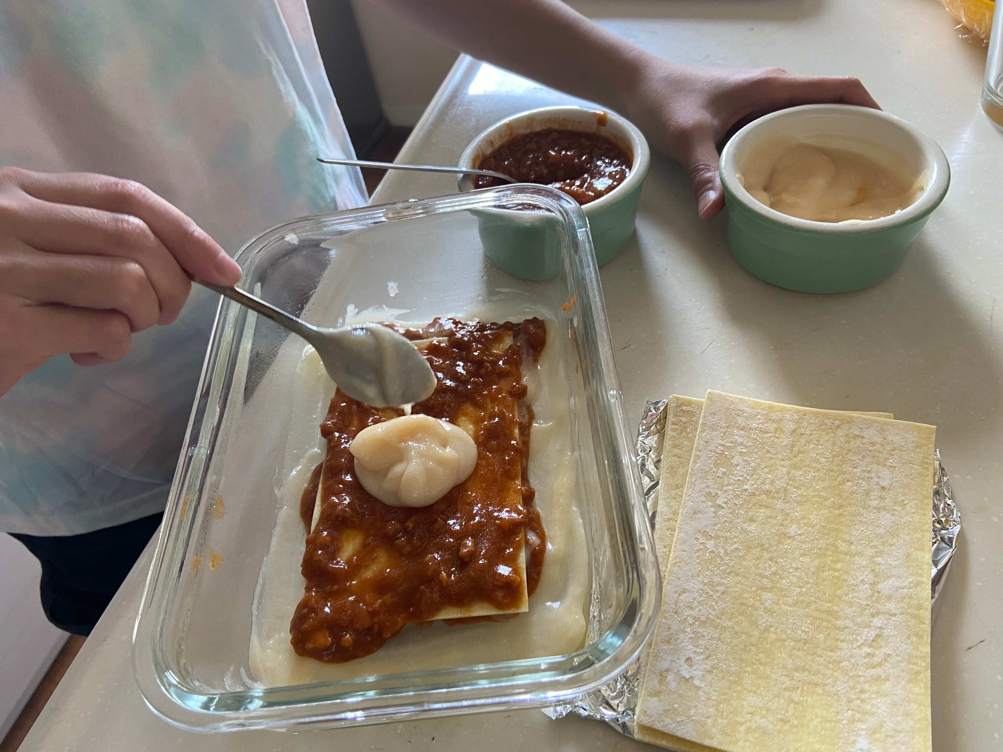 ホワイトソース、ボロネーゼソース、ラザニアの順に重ねていきます。ラザニアは重ねる前に水にくぐらせ粉を落とします。(ビシャビシャに濡れた状態でOK)