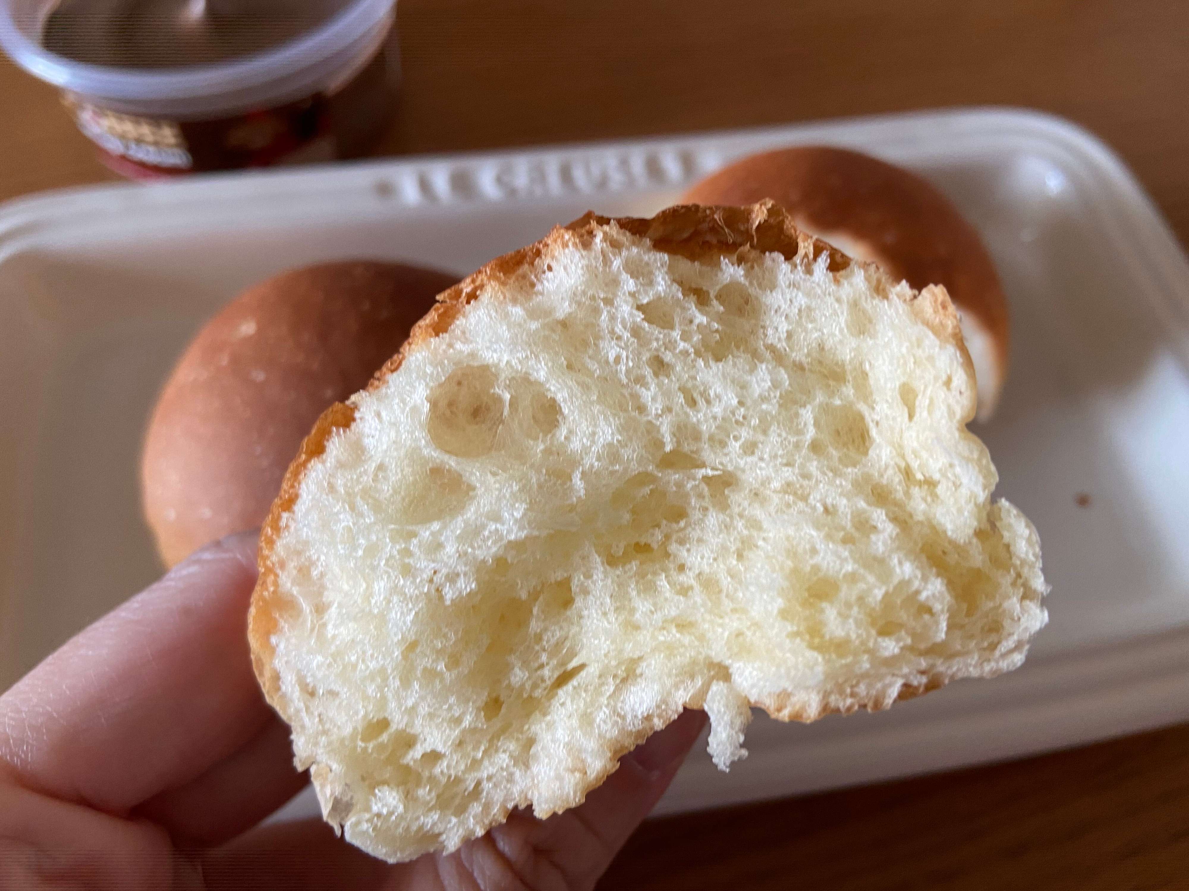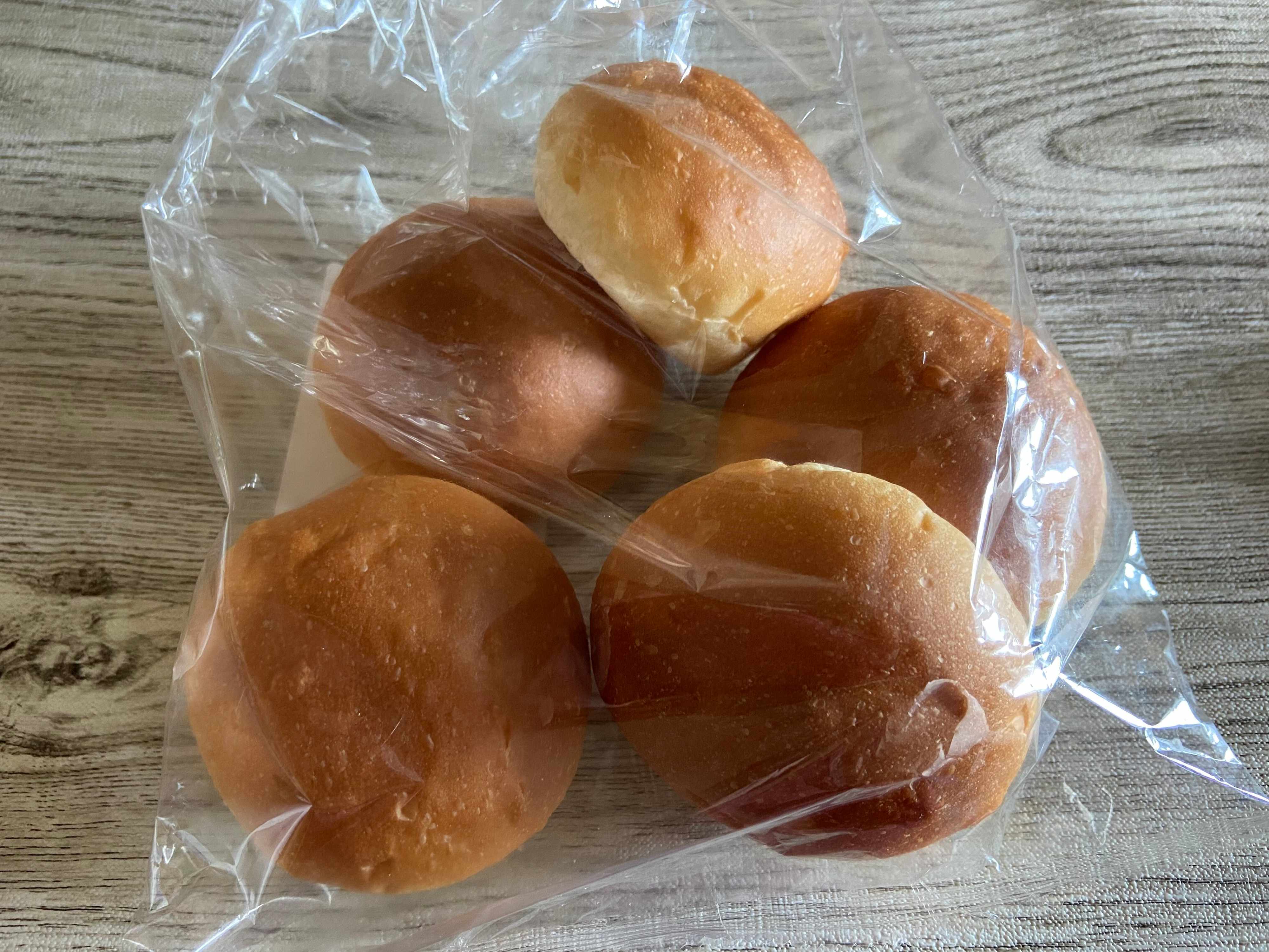 袋の中には5個入っていて、1個当たり約65円。手のひらにおさまるくらいの小ぶりのパンです。北海道美瑛産の小麦とマスカルポーネが使用されていて、持ってみるとふんわりしています。