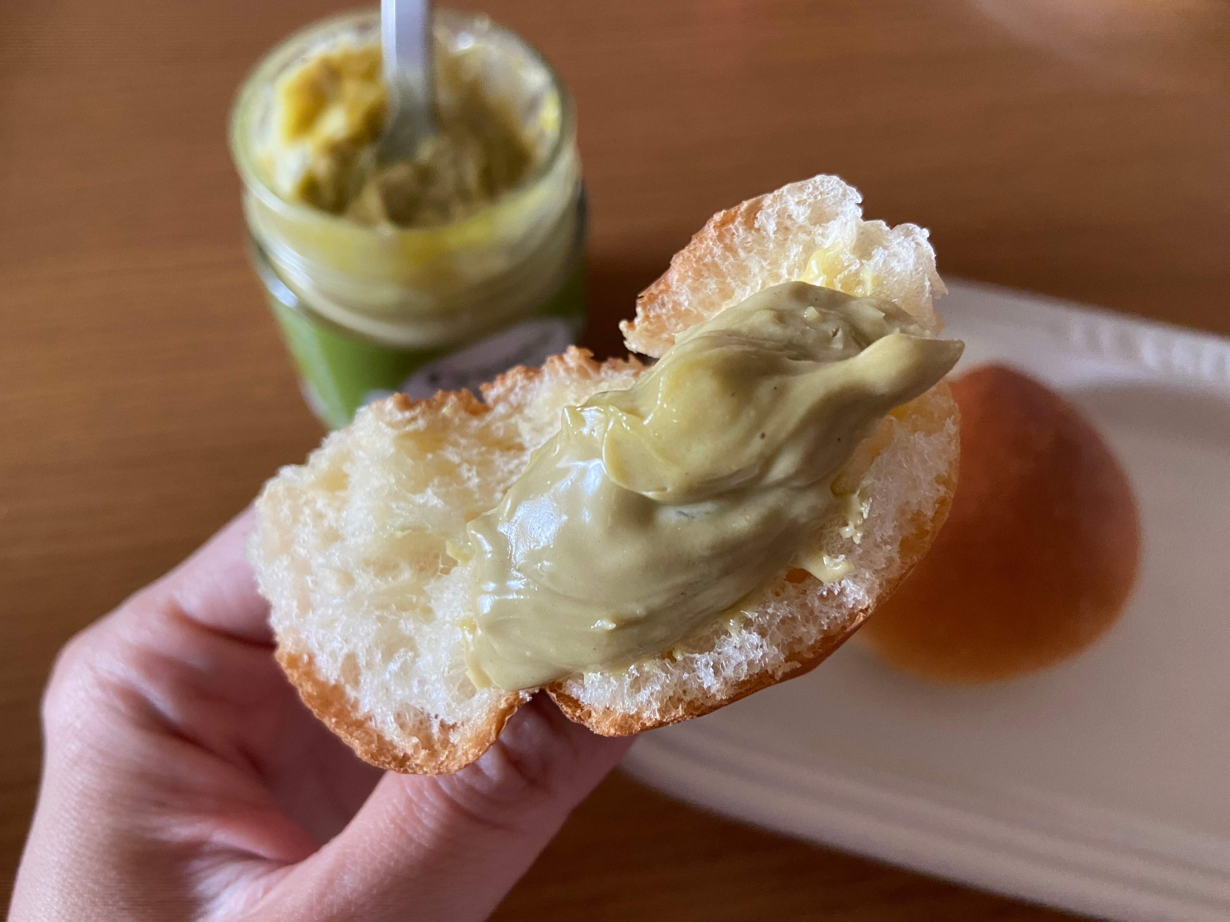 まずはお好みのジャムやスプレッドで。おすすめは成城石井ヒットアイテムのピスタチオスプレッド。濃厚でコクのあるスプレッドとも相性抜群です。