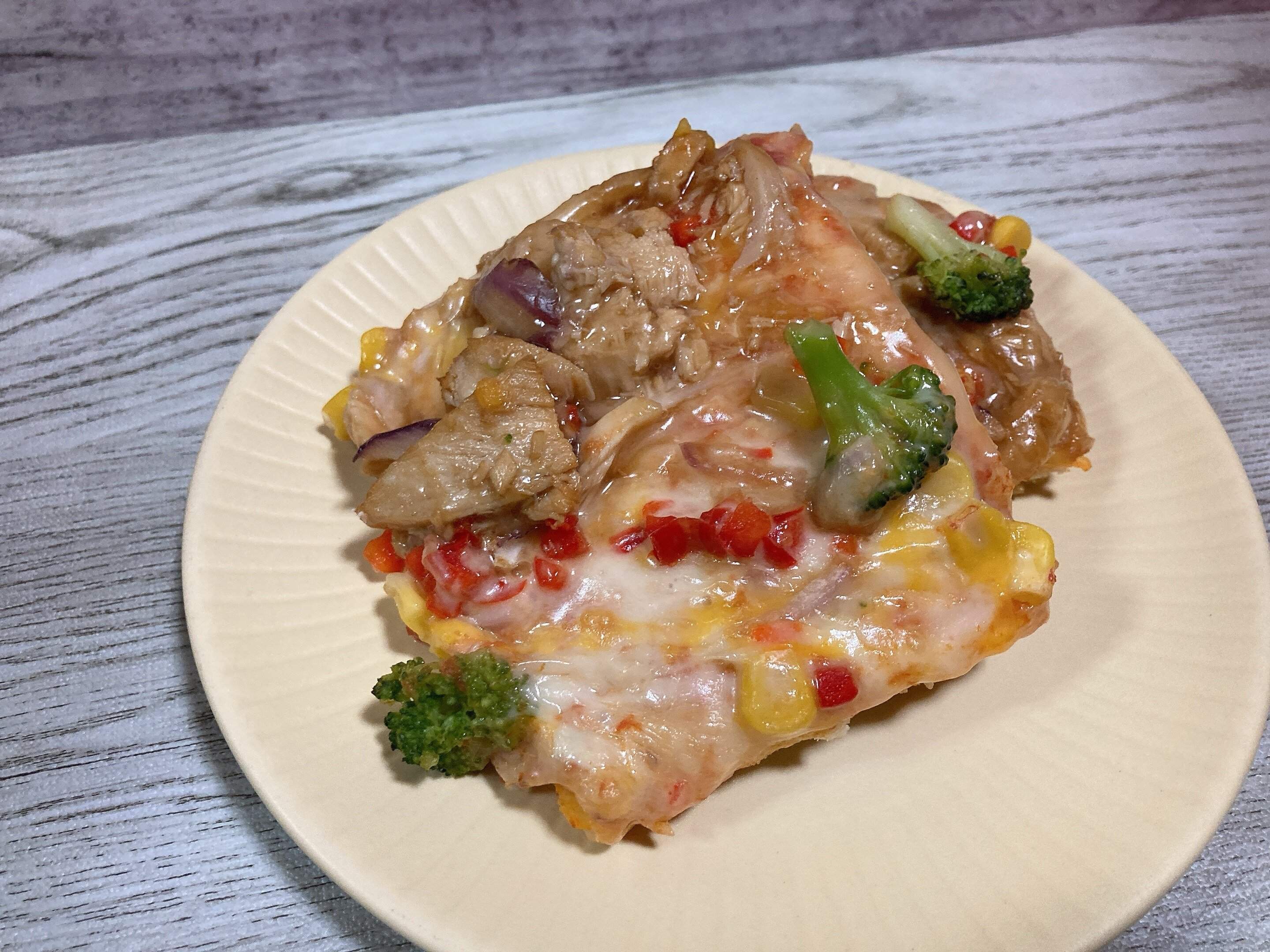 こんがり焼けたピザはチーズとテリヤキソースの甘い香りが食欲をそそります。あつあつを食べると、チーズがのび、チキンがやわらかく甘塩っぱいテリヤキソースがおいしい!