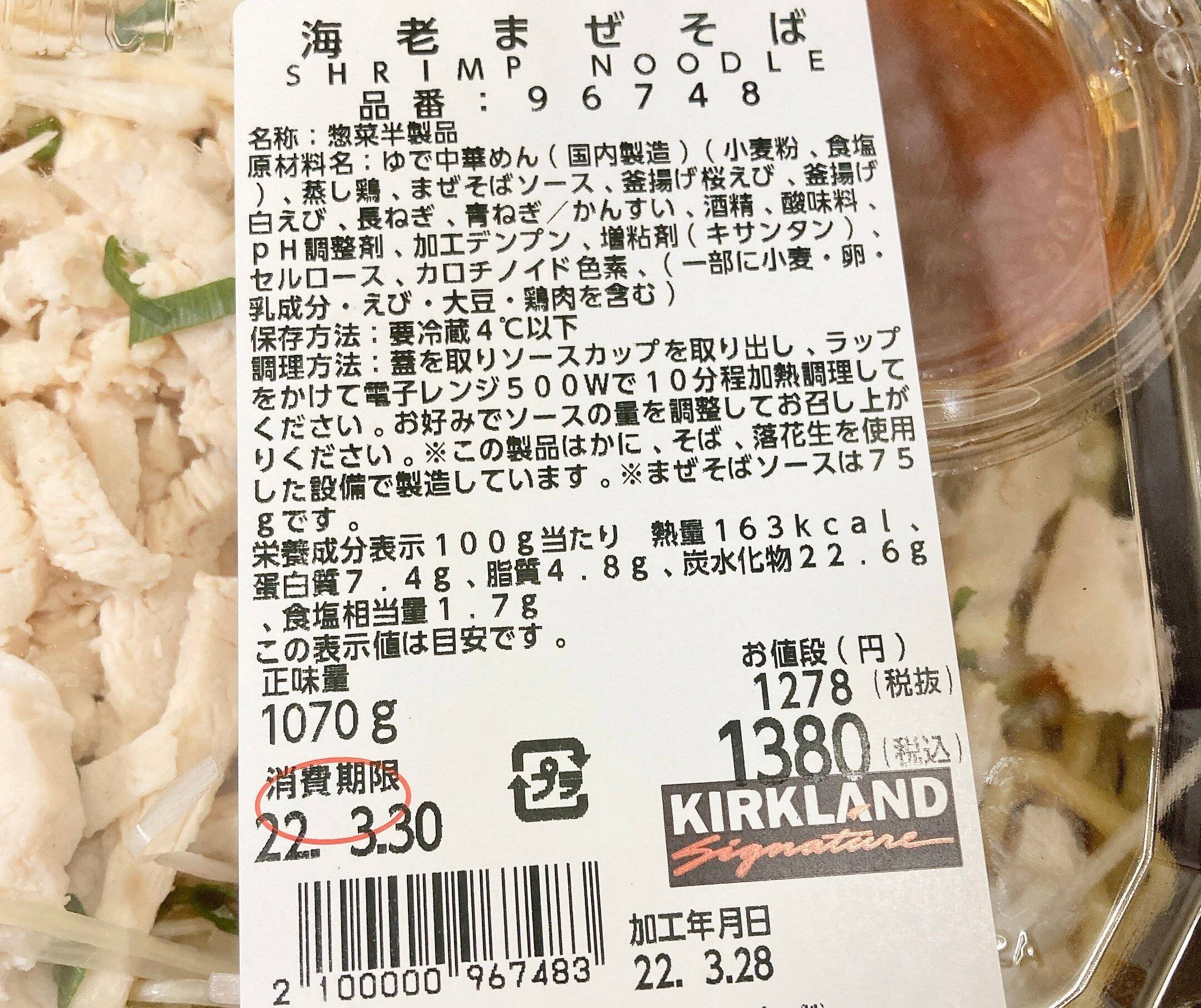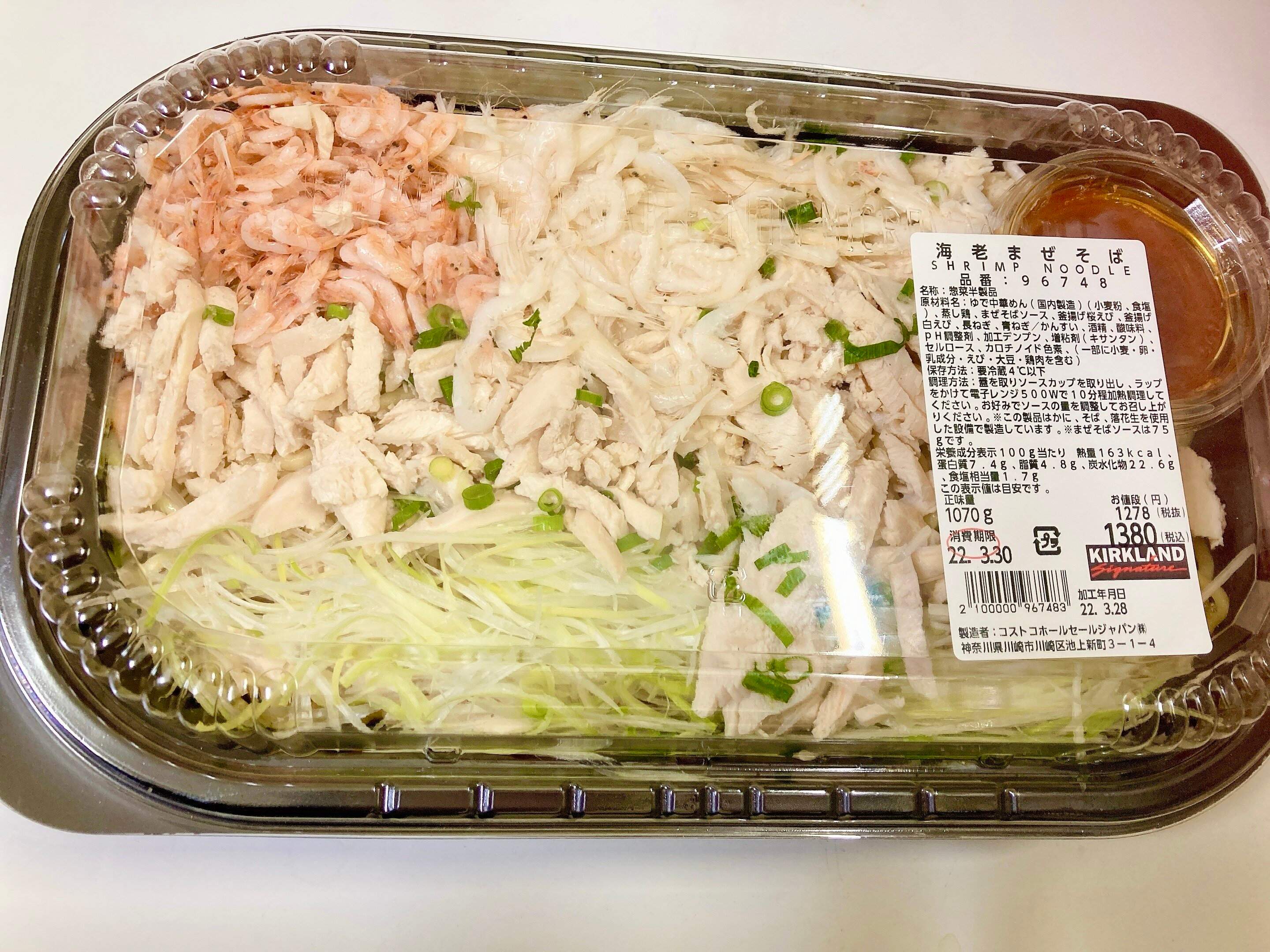 コストコデリカコーナーの新作まぜそばは、旬の桜えびと白えびがたっぷりのえび好きにはたまらない商品。食べ方はフタをはずし、ソースを取り出し、ラップをかけ500Wのレンジで約10分ほど加熱後、ソースを混ぜ完成。一度にすべて食べない場合は、お皿にうつし様子を見ながら加熱してくださいね。