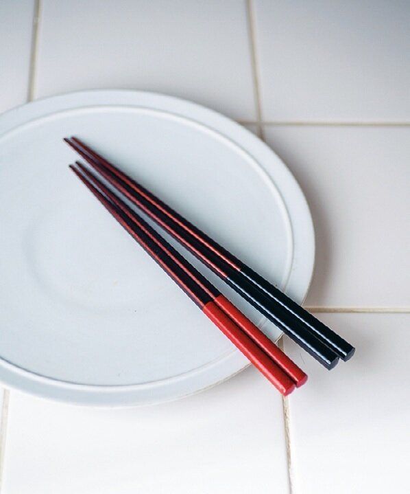 若狭塗箸 塗分 赤(食洗機対応、21cm)、同 黒(食洗機対応、23cm)各¥330