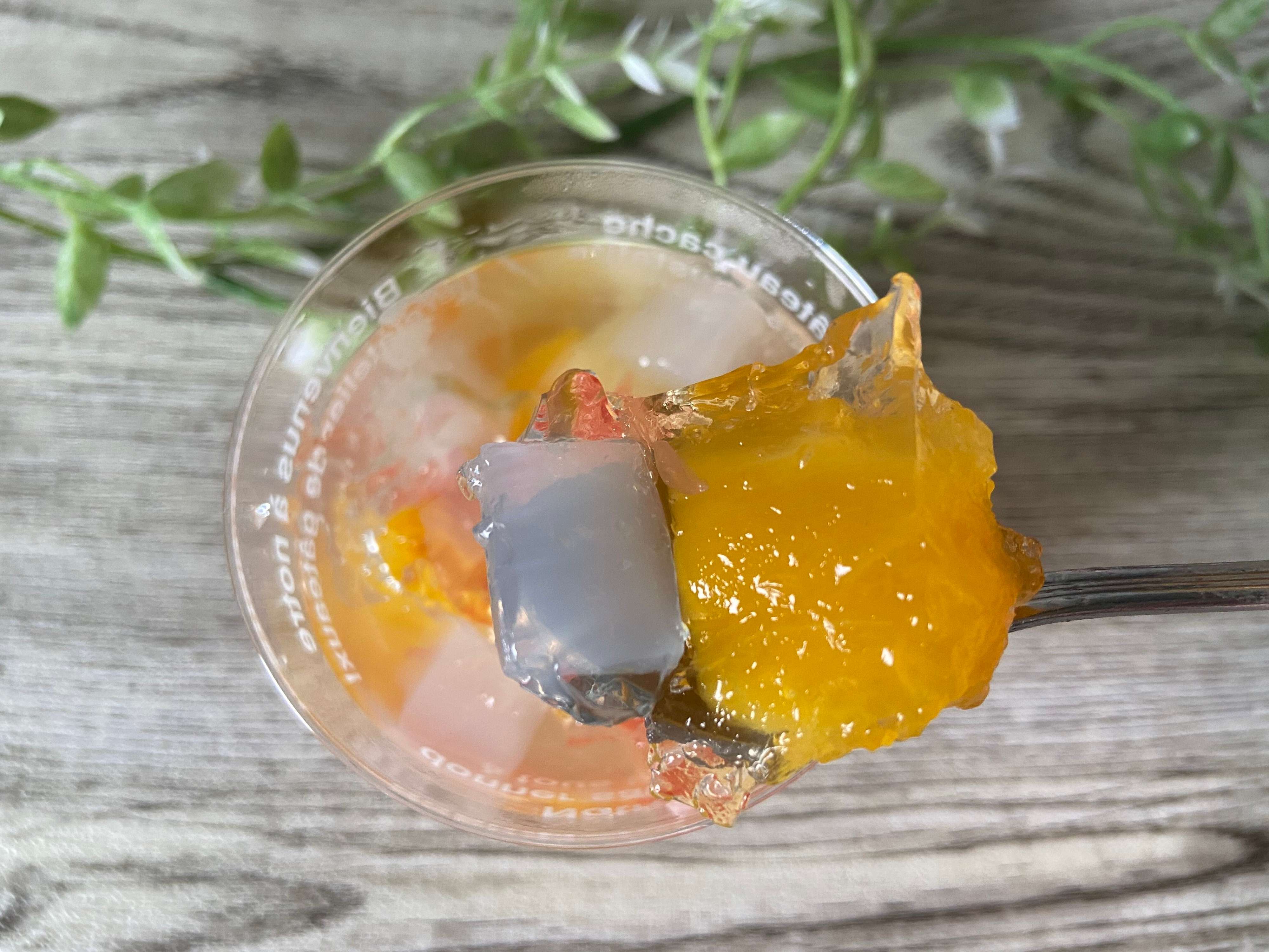角切りのマンゴーはレモン汁とグラニュー糖で甘みを引き出しているそう。とろける濃厚な味わいがリッチです。ナタデココのコリコリっとした食感もアクセントになり、甘さ控えめのゼリーでさっぱりといただけるスイーツ!