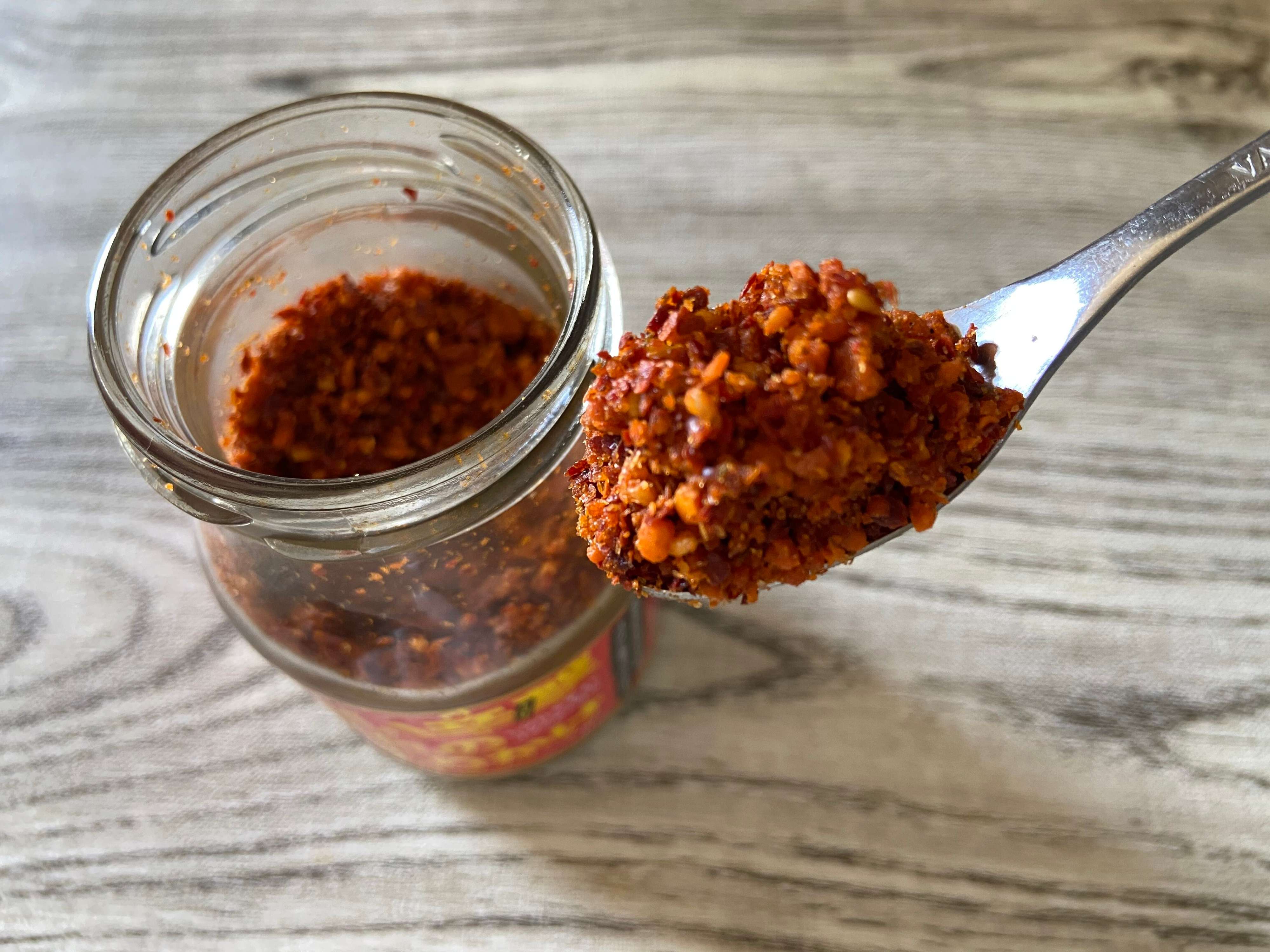 フライドガーリック、オニオン、唐辛子、ローストピーナッツ、ごま、生姜などを独自の配合でミックスしているそうで、香ばしいよい香りがします。