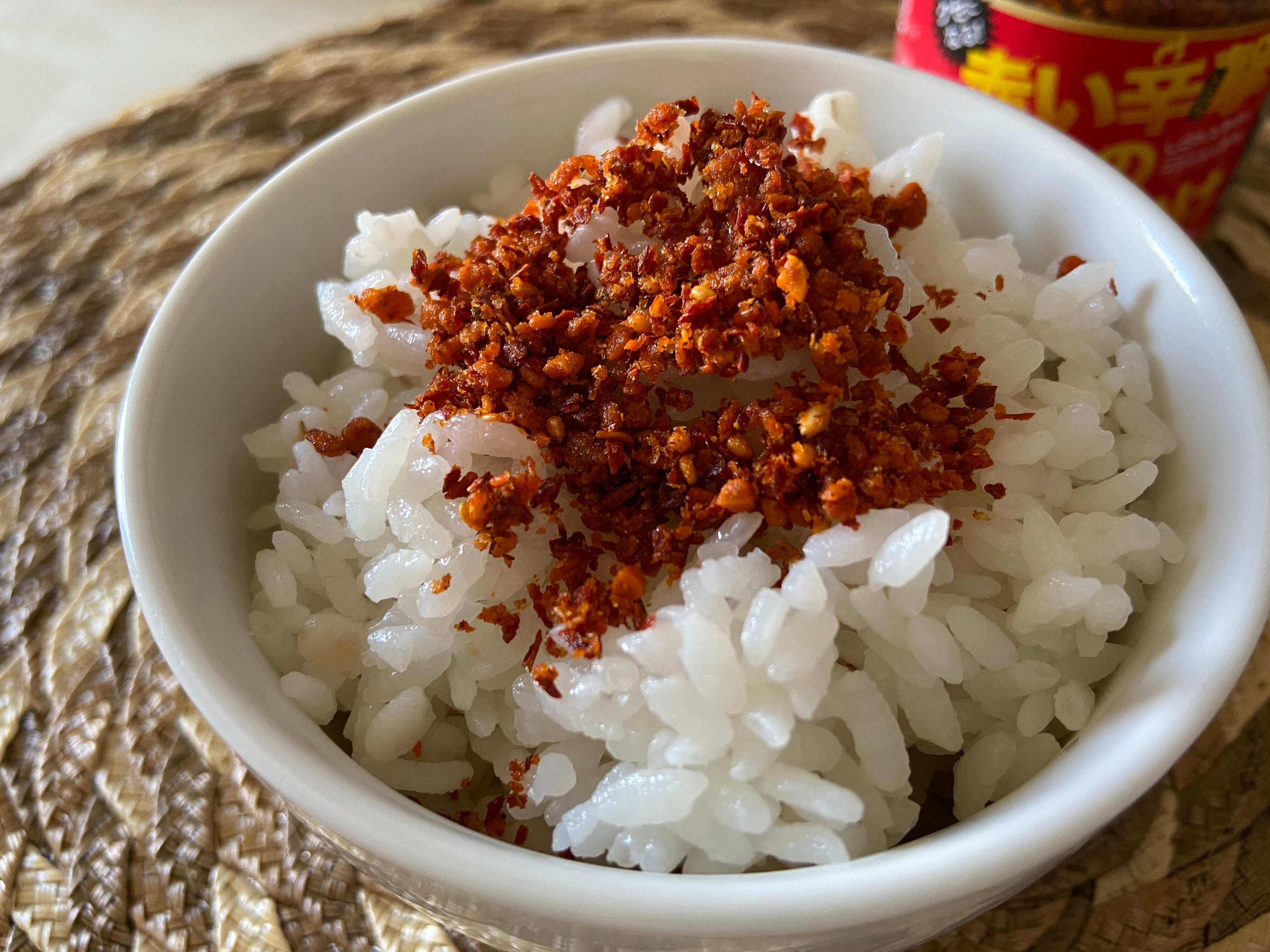 ご飯の上にかけてさっそく食べてみると、ザクザク食感で唐辛子の辛みがぐっと押し寄せてきます。そのあとに旨みが感じられてあとを引くおいしさ!