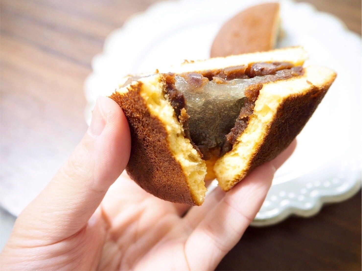 どらやき生地にはたっぷりと粒餡が入っており、さらにその中にお餅が入っています。