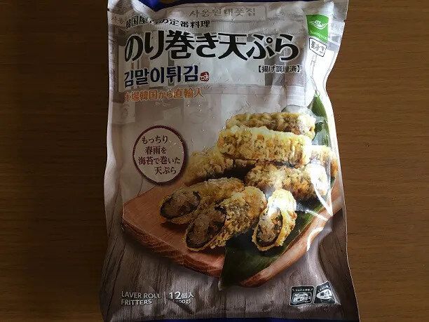 韓国屋台の定番料理「のり巻き天ぷら」(購入時:321円)。春雨ののり巻きに衣をつけて揚げた日本ではあまりなじみのないフード。
