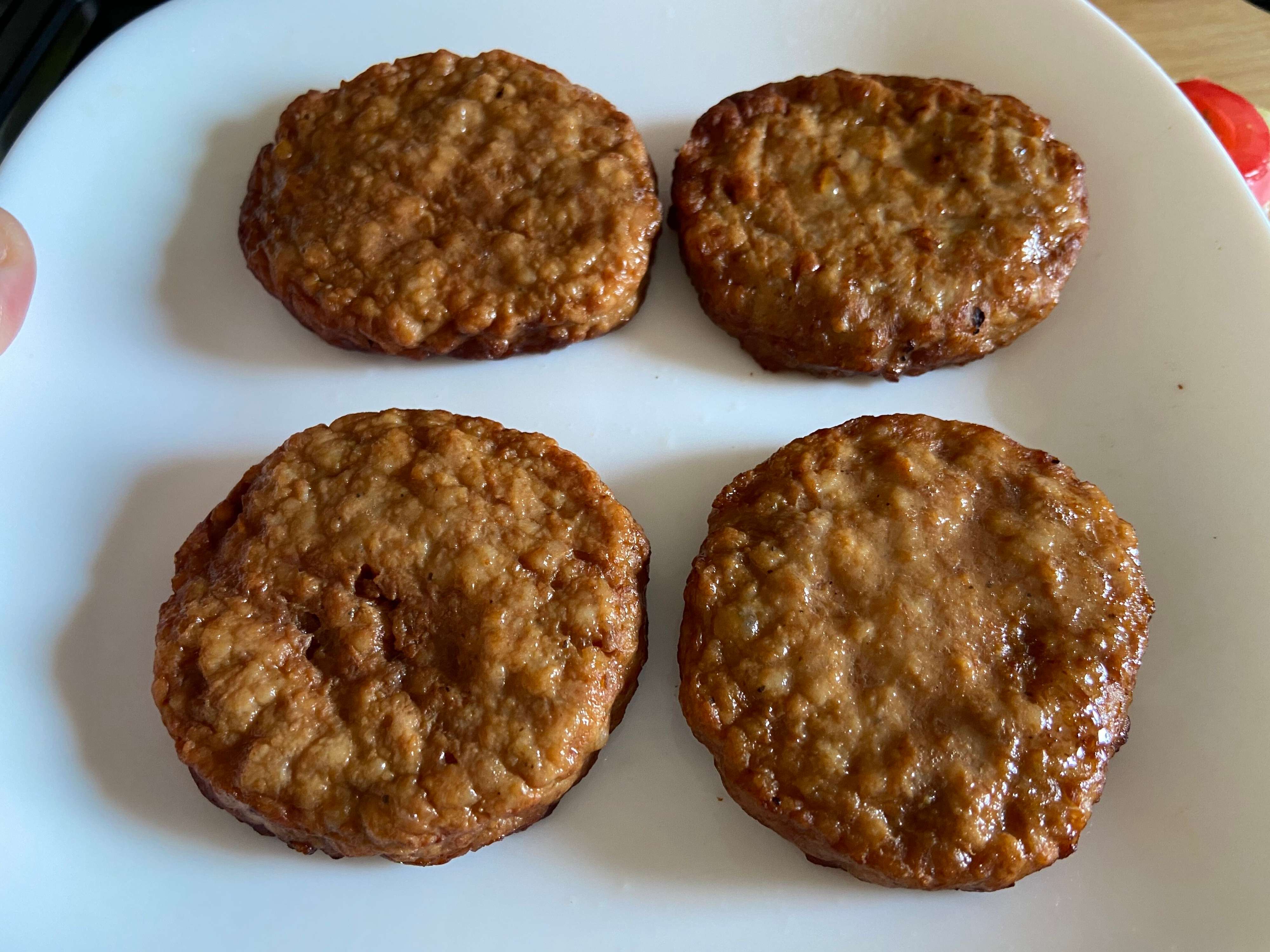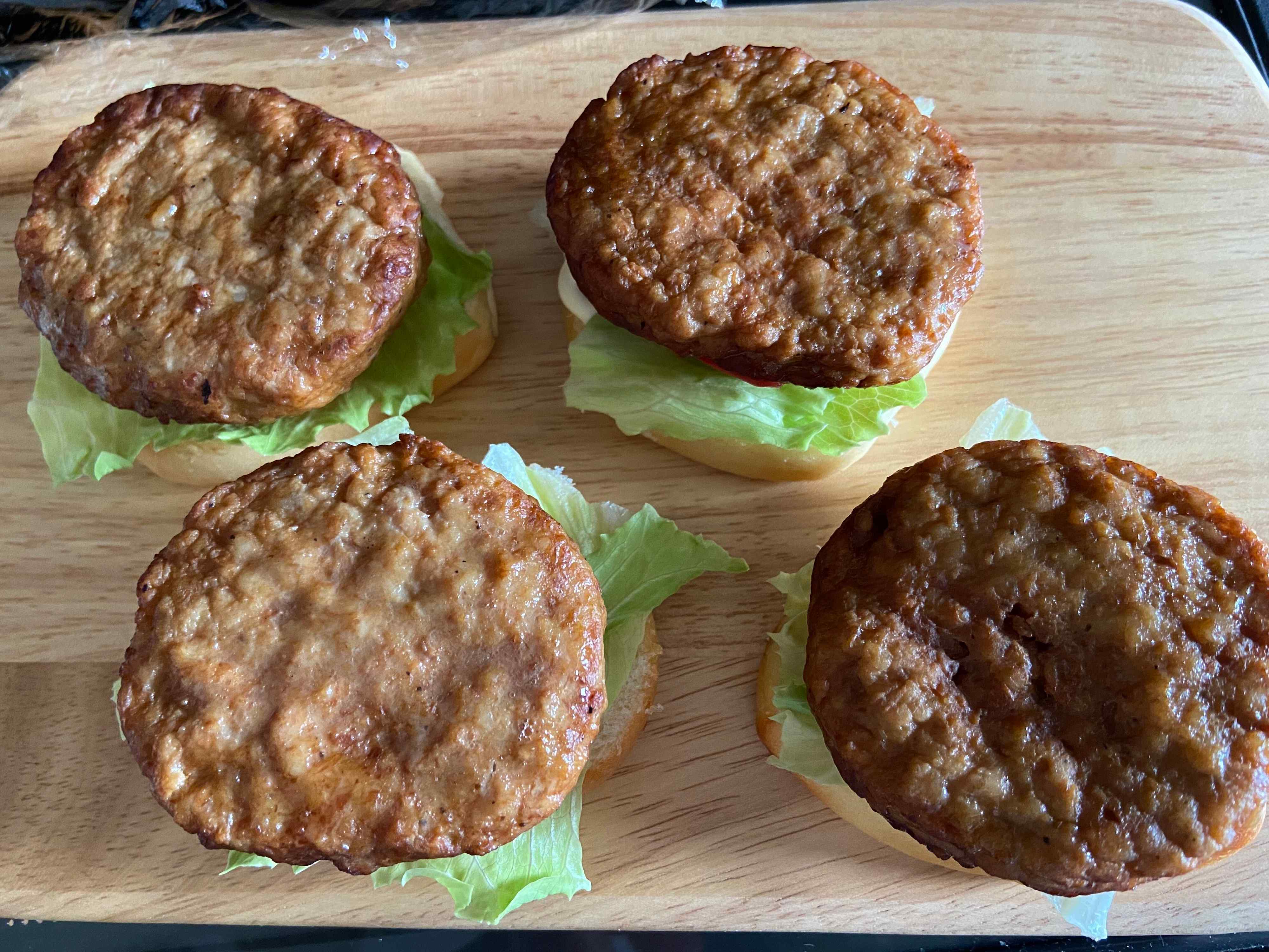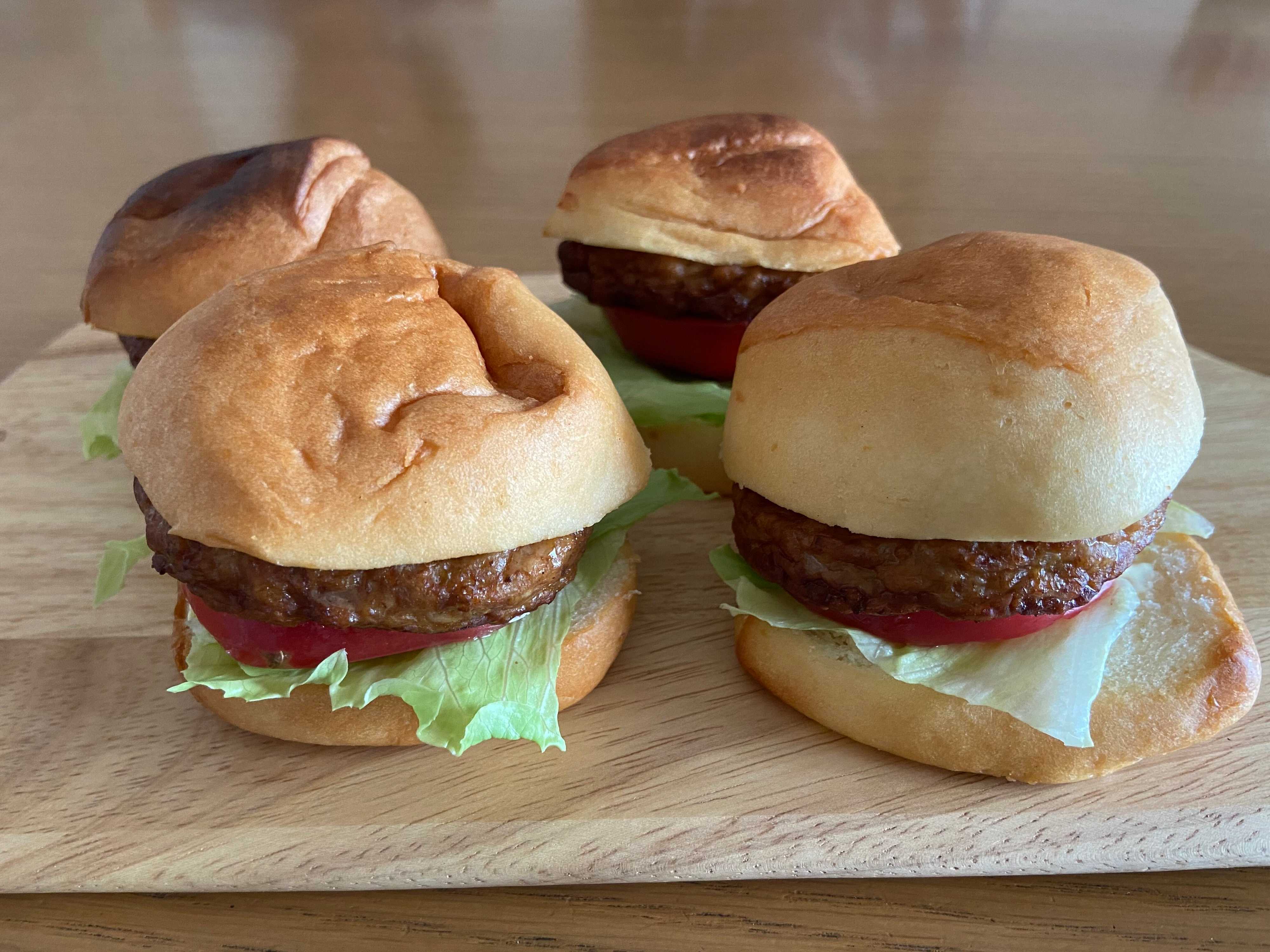 マスカルポーネロールやディナーロールと、このグリルパティのサイズ感がぴったりでかわいいハンバーガーができました。朝食に出したら筆者の子どもたちも大喜び。