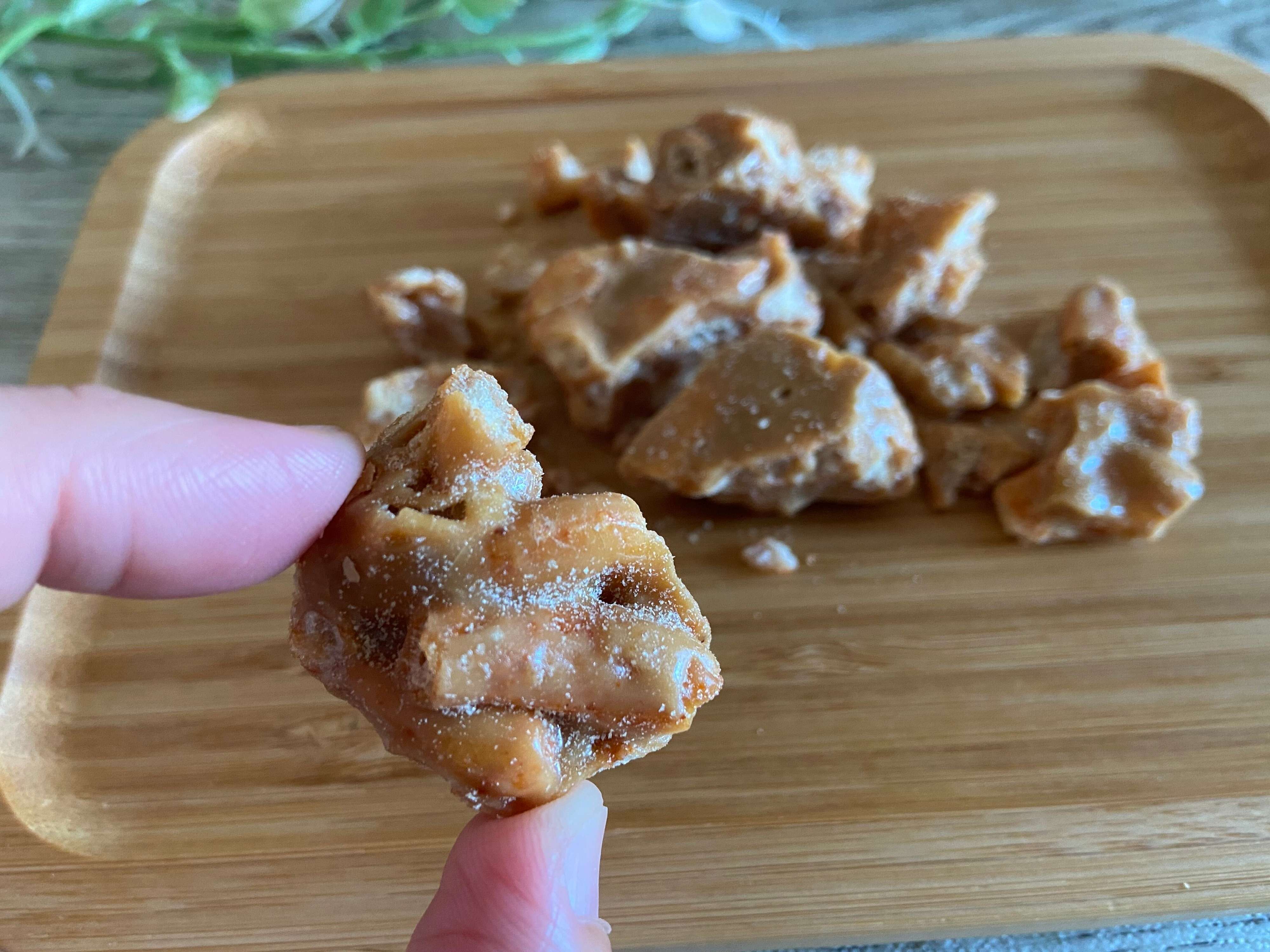 袋の中身をすべて出してみると、ごつごつとしたキャラメルのようなお菓子が。