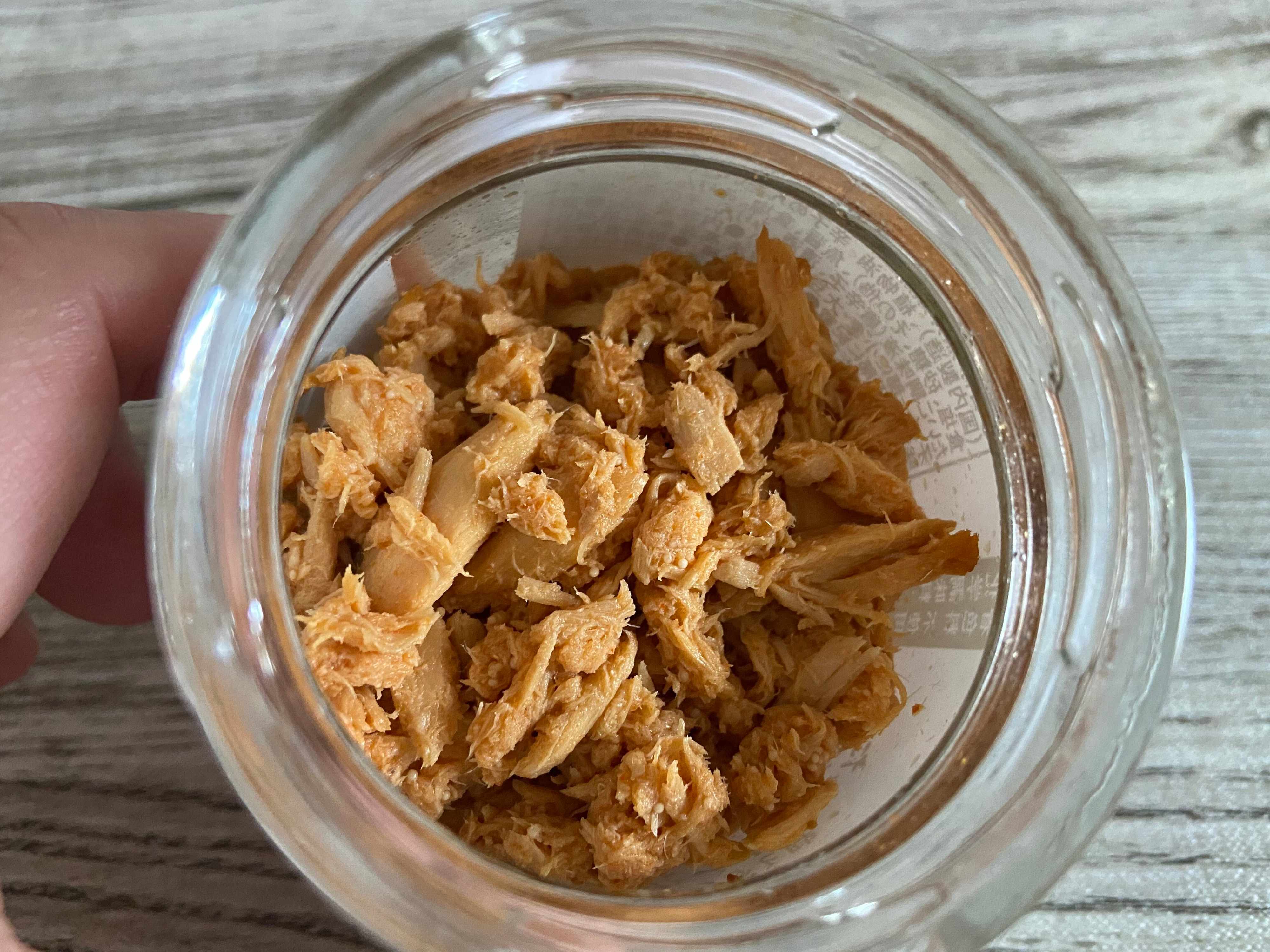 ツナフレークに辛子明太液を加えた、辛みの効いた大人のご飯のおともとのこと。粗ほぐしのツナがとってもおいしそう。下に辛子明太液が溜まっていたので、しっかりかき混ぜてから使用しました。