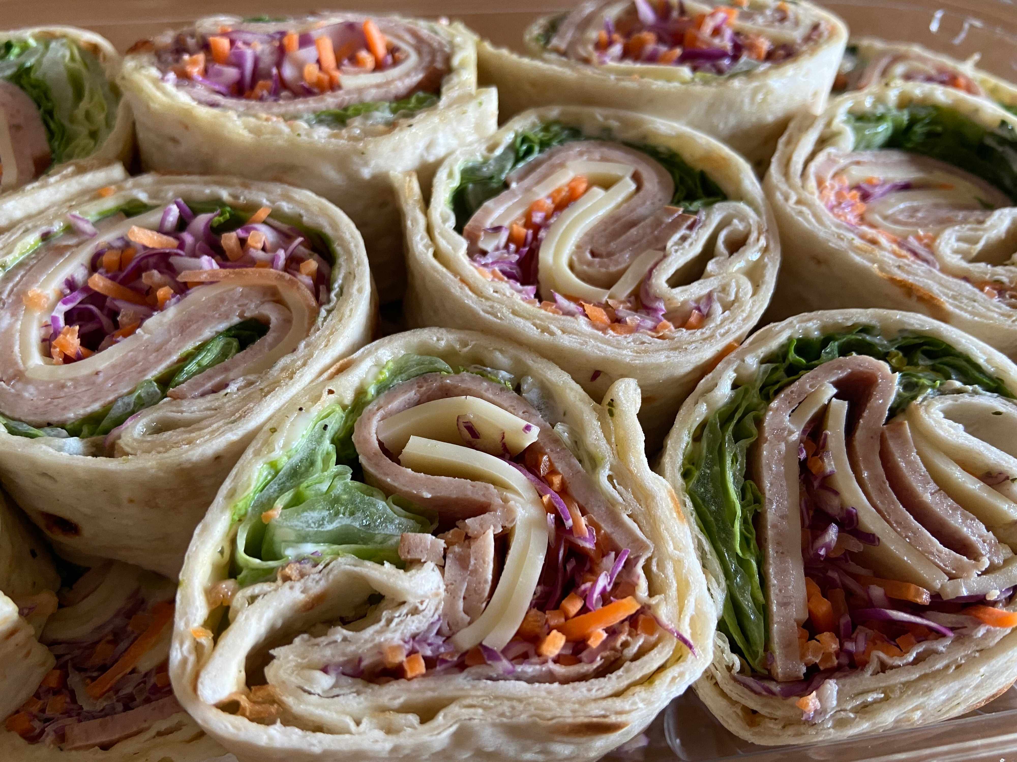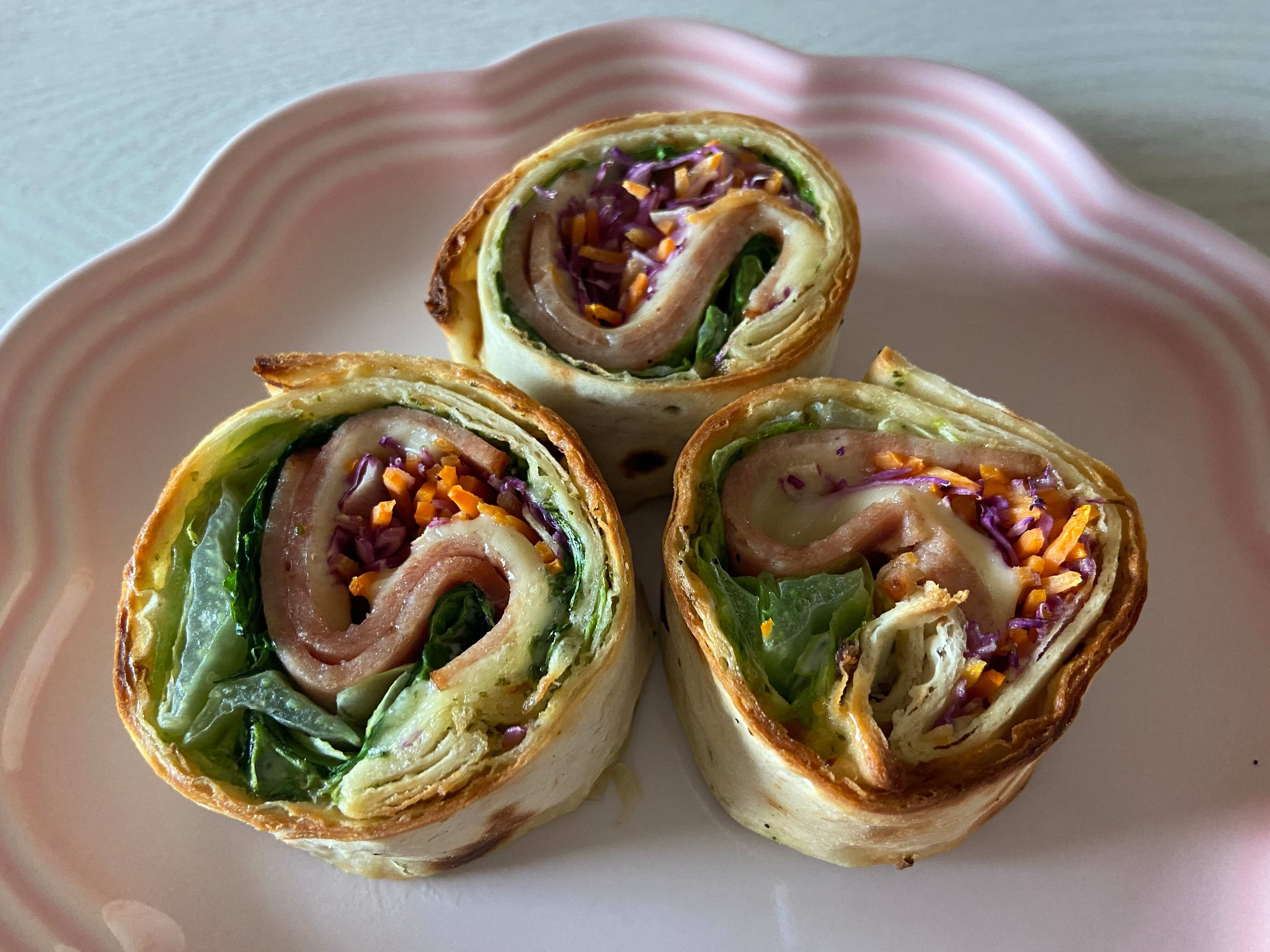 トルティーヤのような薄い生地のハイローラーブレッドに赤キャベツと人参の千切り、ボローニャソーセージ、ナチュラルチーズ、レタスがギュッと巻き込まれて具だくさん!