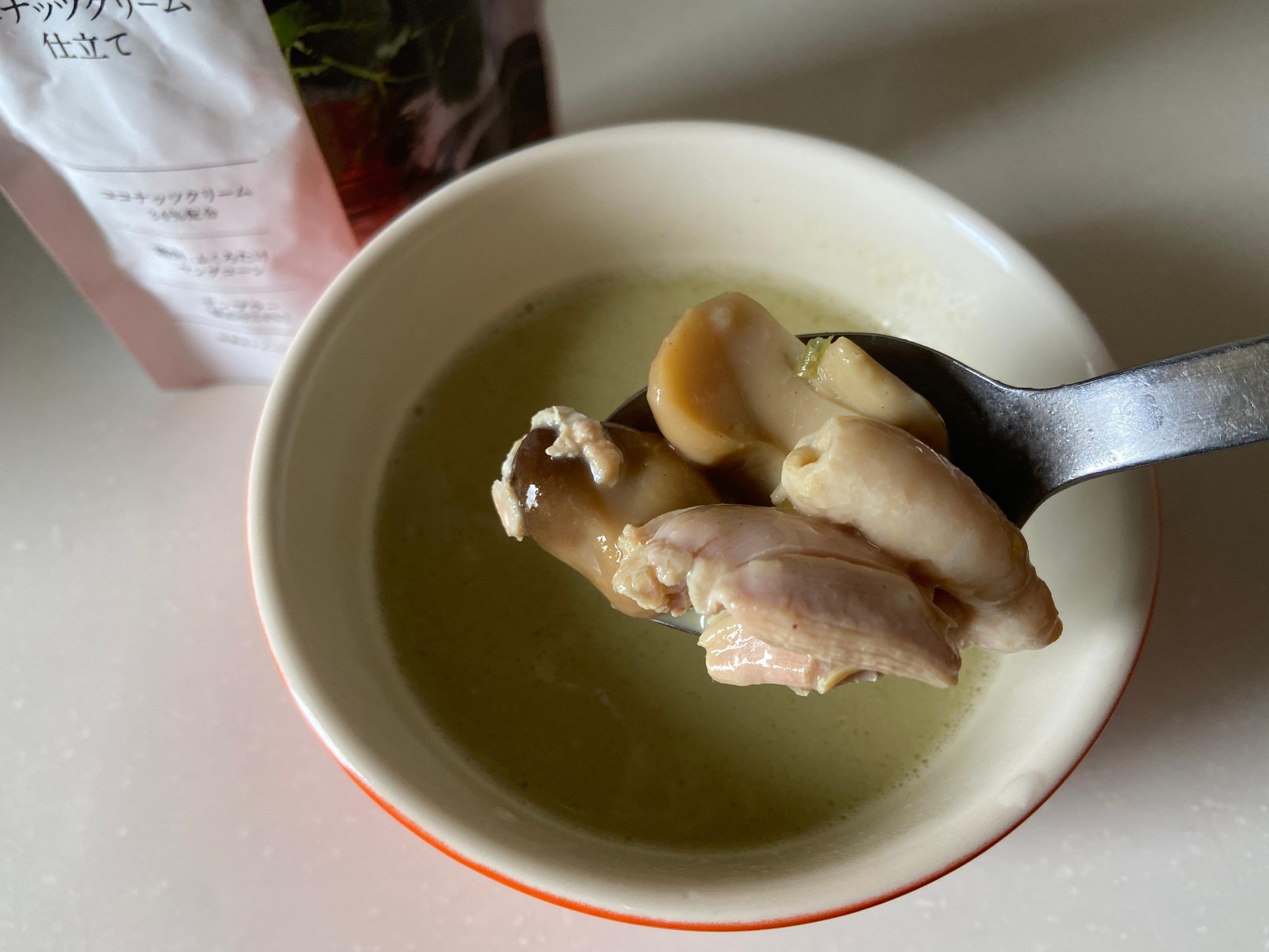 調理は簡単、湯煎で5分温めるだけ。鶏肉、ふくろたけ、ヤングコーンの3種具材がごろっと入って、爽やかな酸味と後味にピリッと辛さがやってきてまろやかでとってもおいしい!