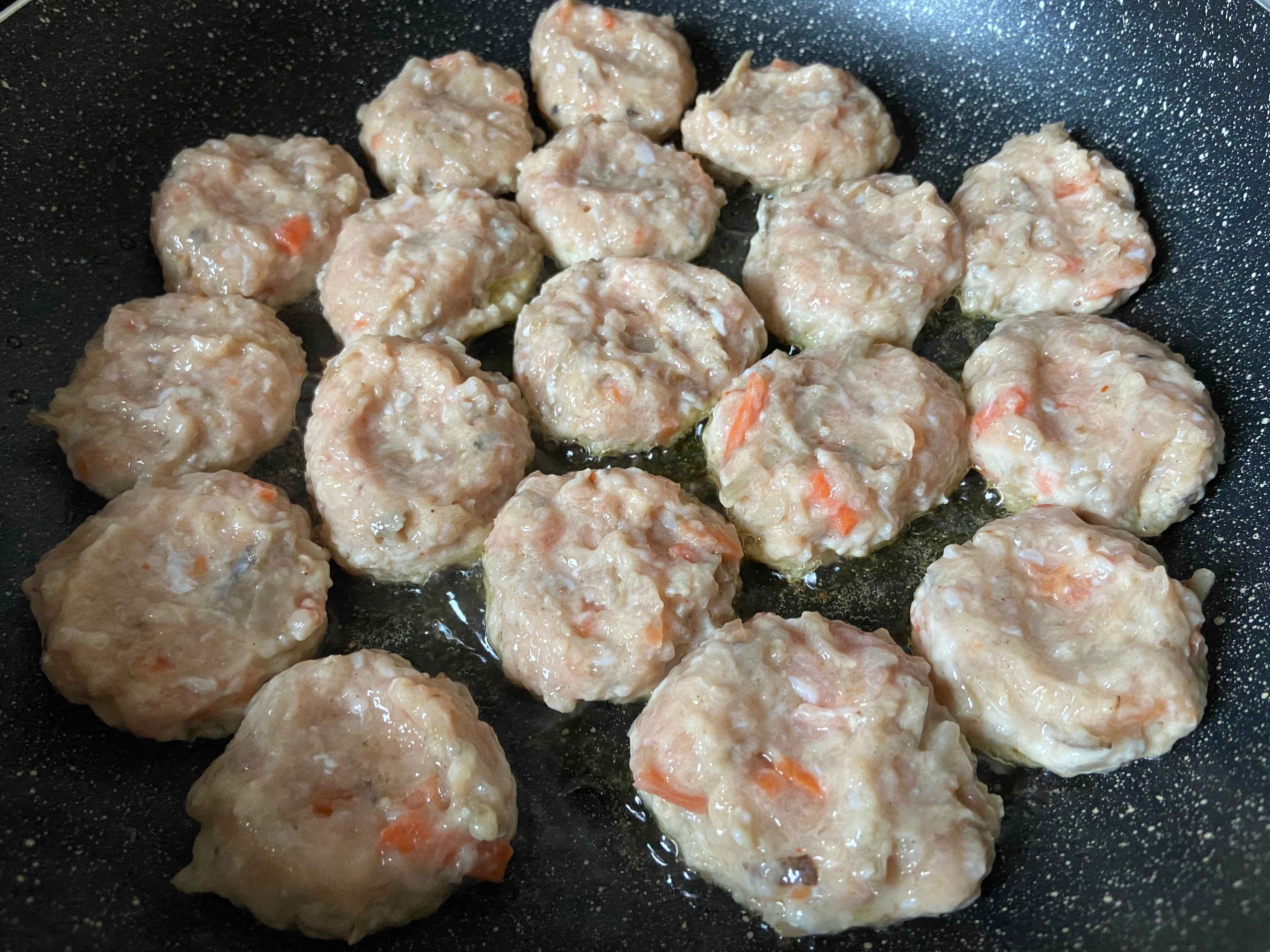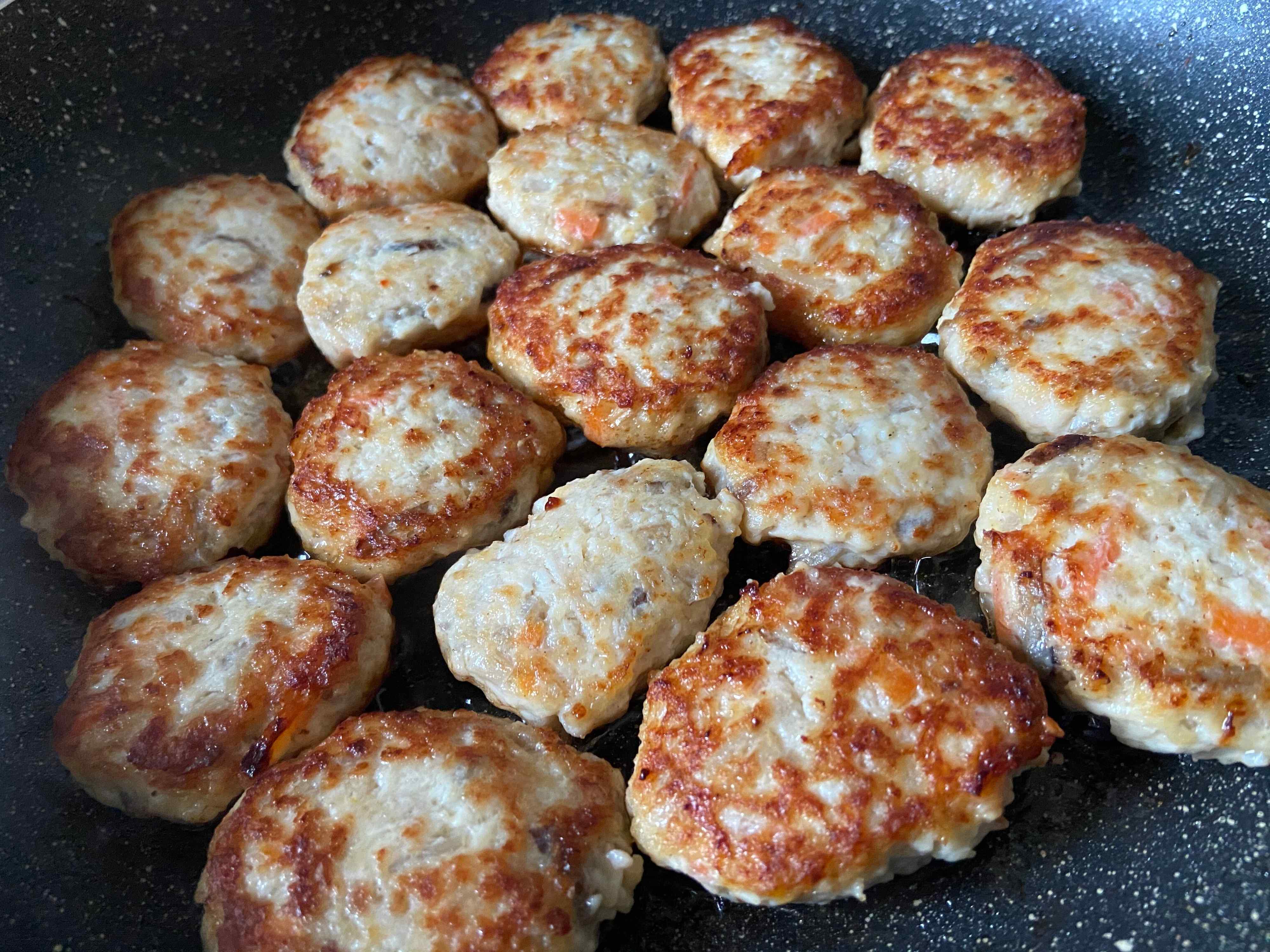 よくこねたら、スプーンで丸く形を整えてフライパンで焼きます。中火で片面焼いたらひっくり返して火を弱めフタをして蒸し焼きに。