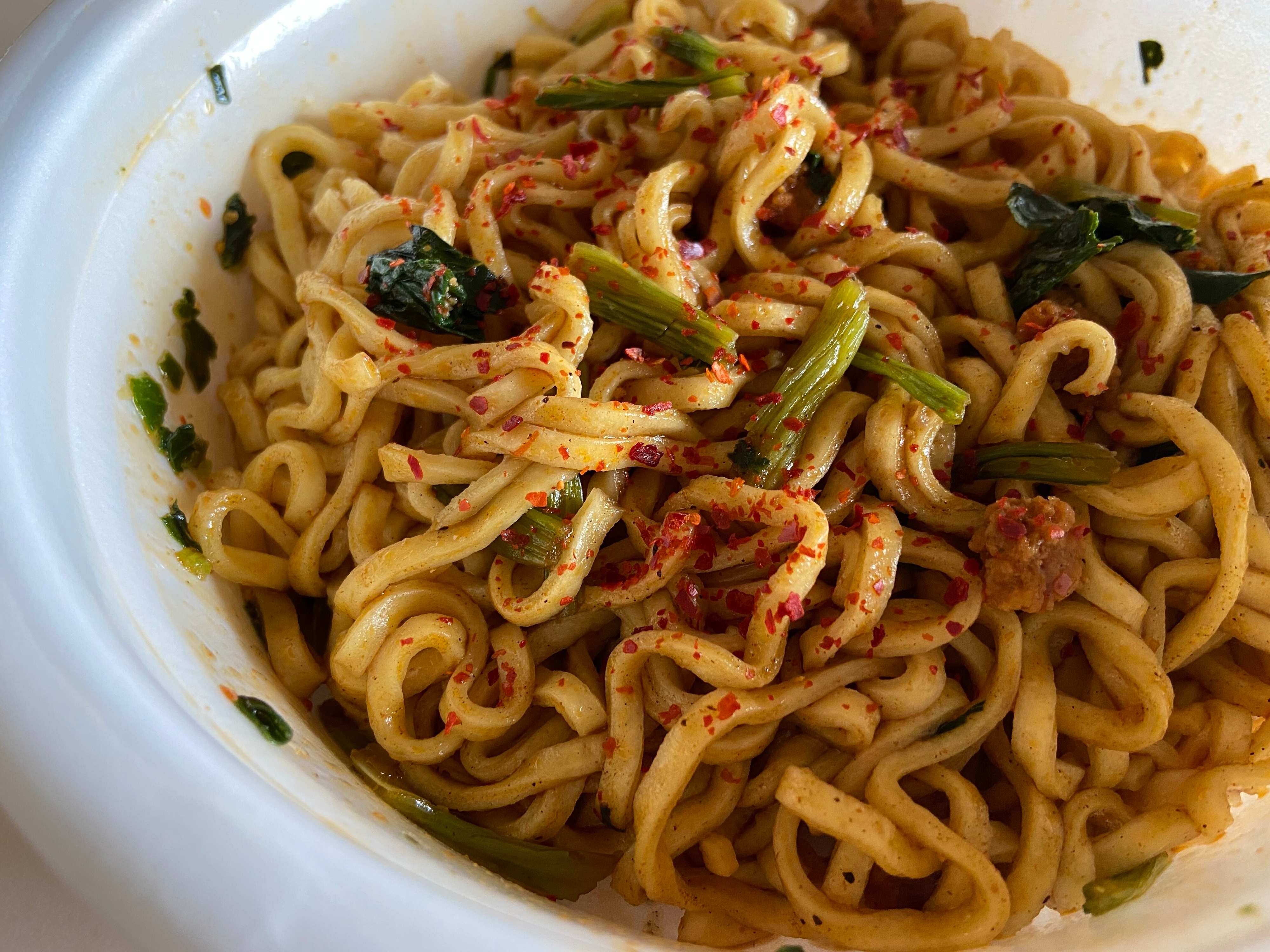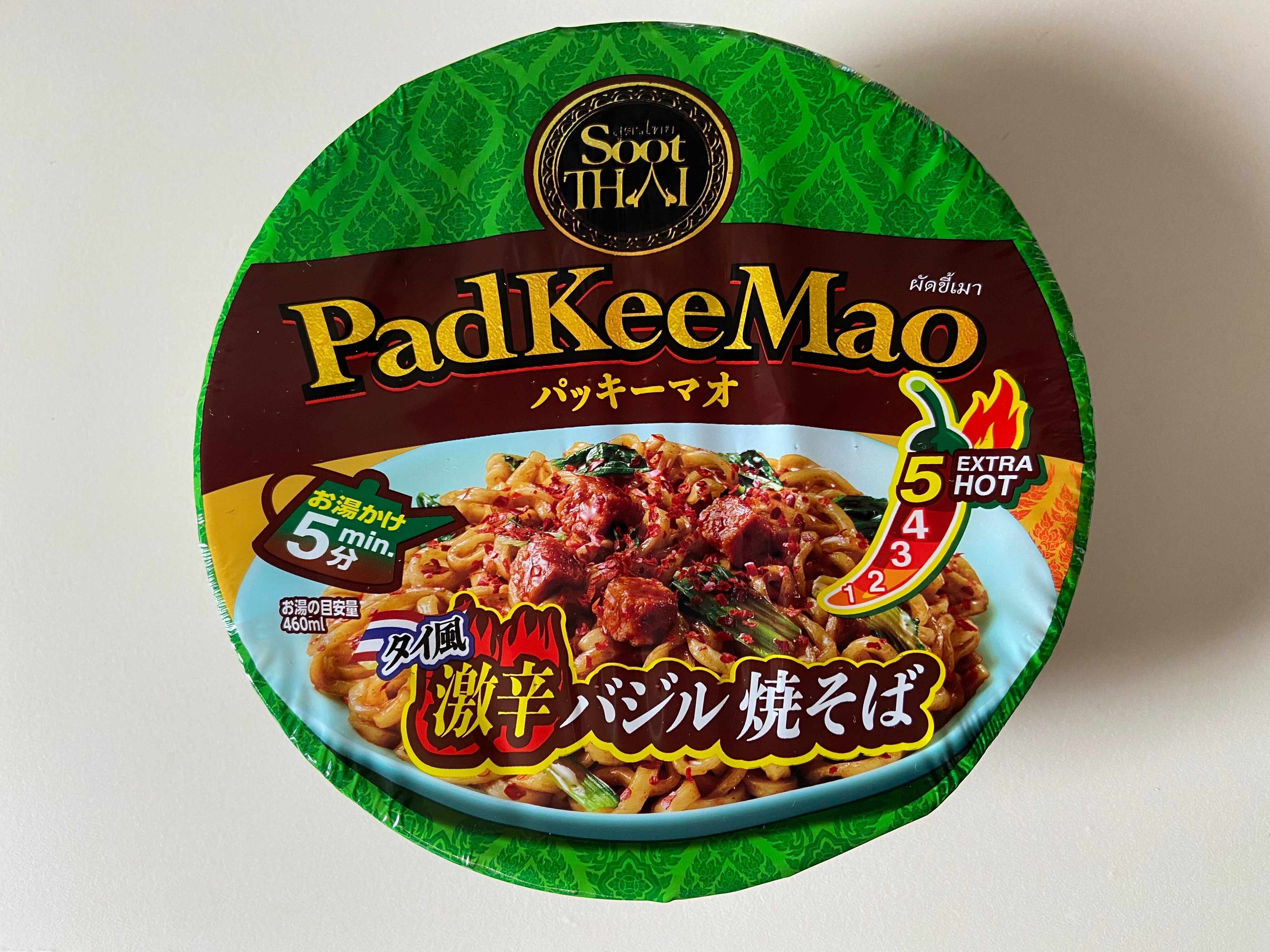 つづいては「パッキーマオ激辛バジル焼そば」(購入時:226円)です。辛いものがそこまで得意ではないのになぜか惹かれて購入してしまいました。