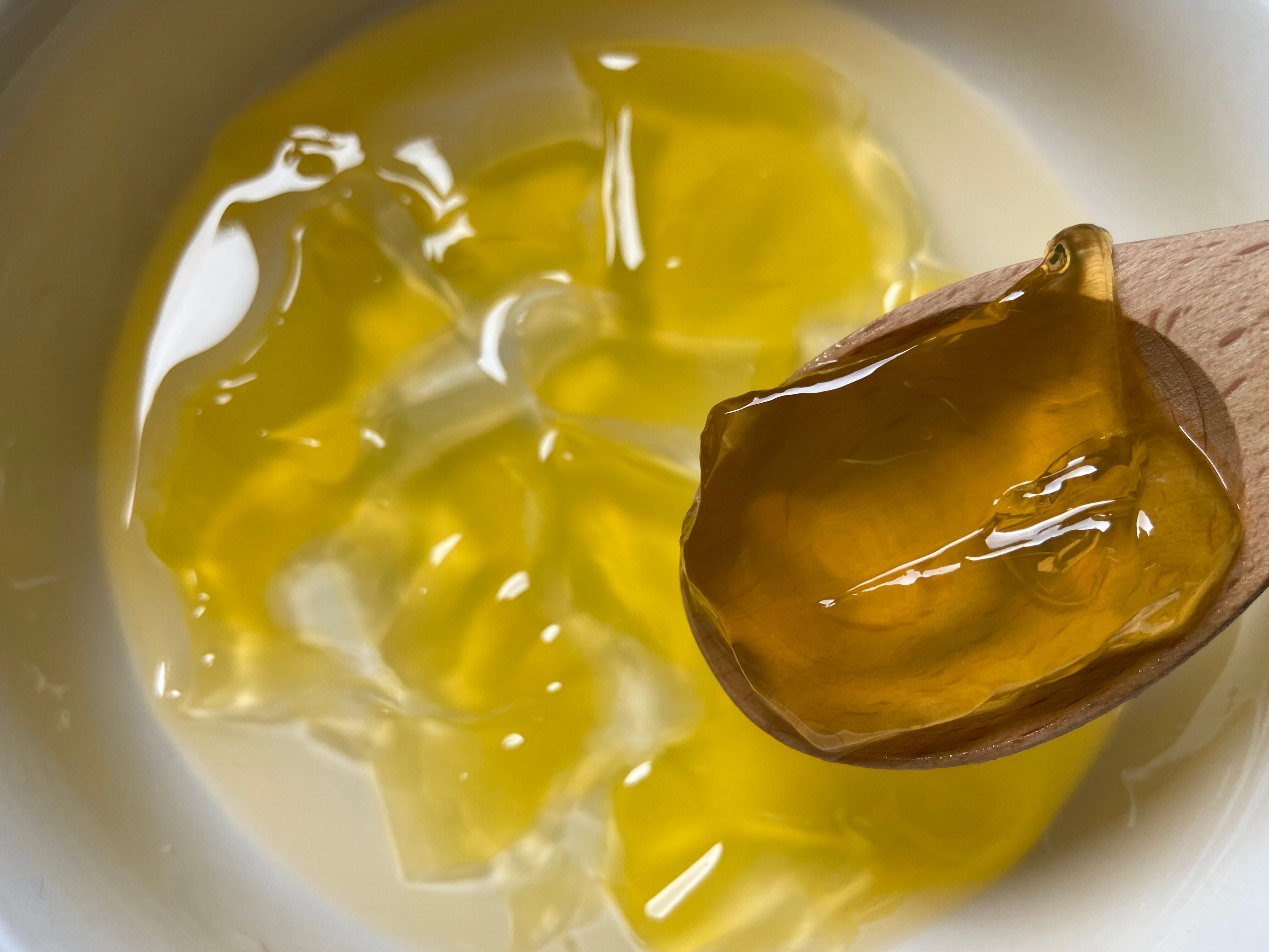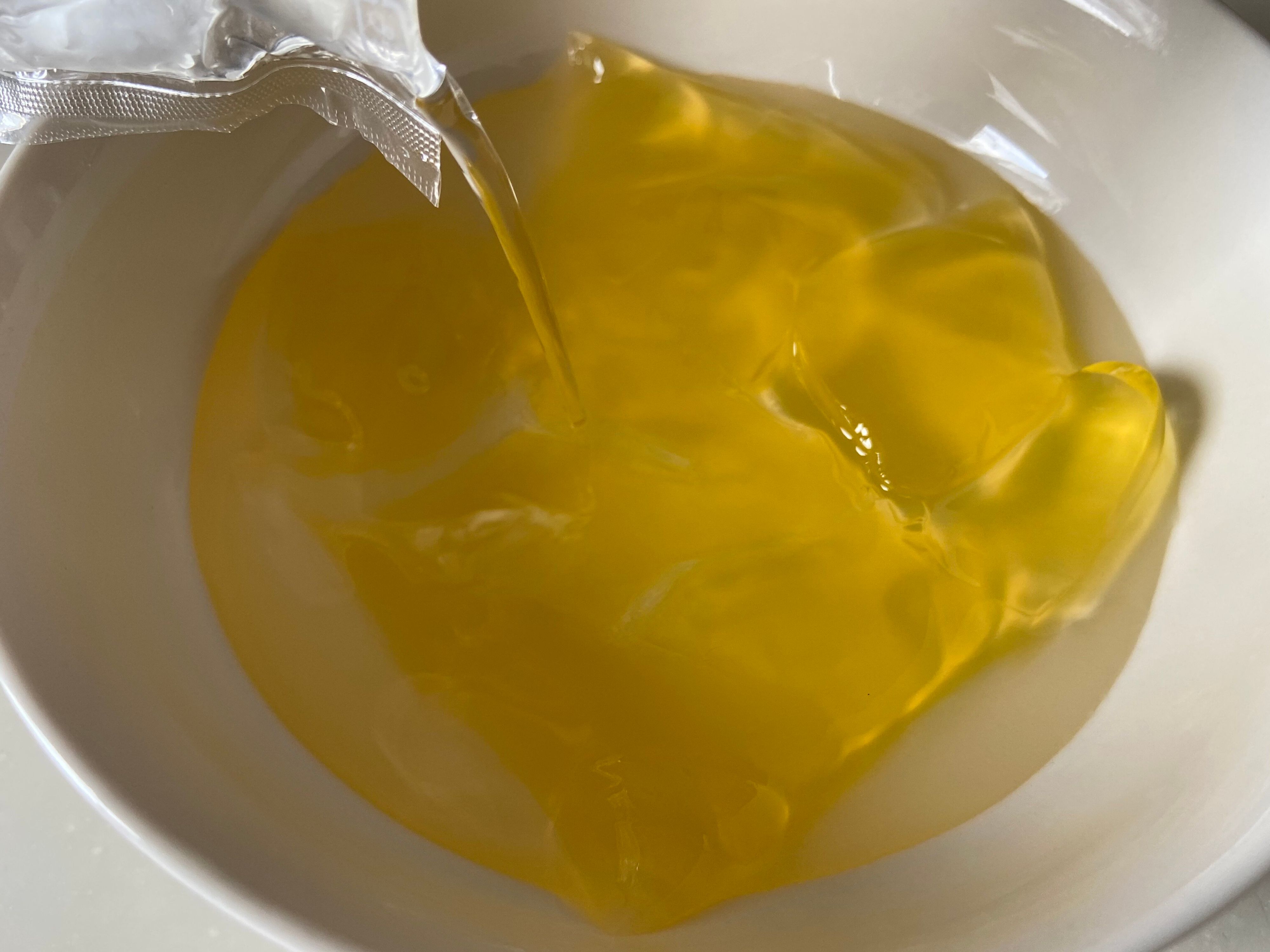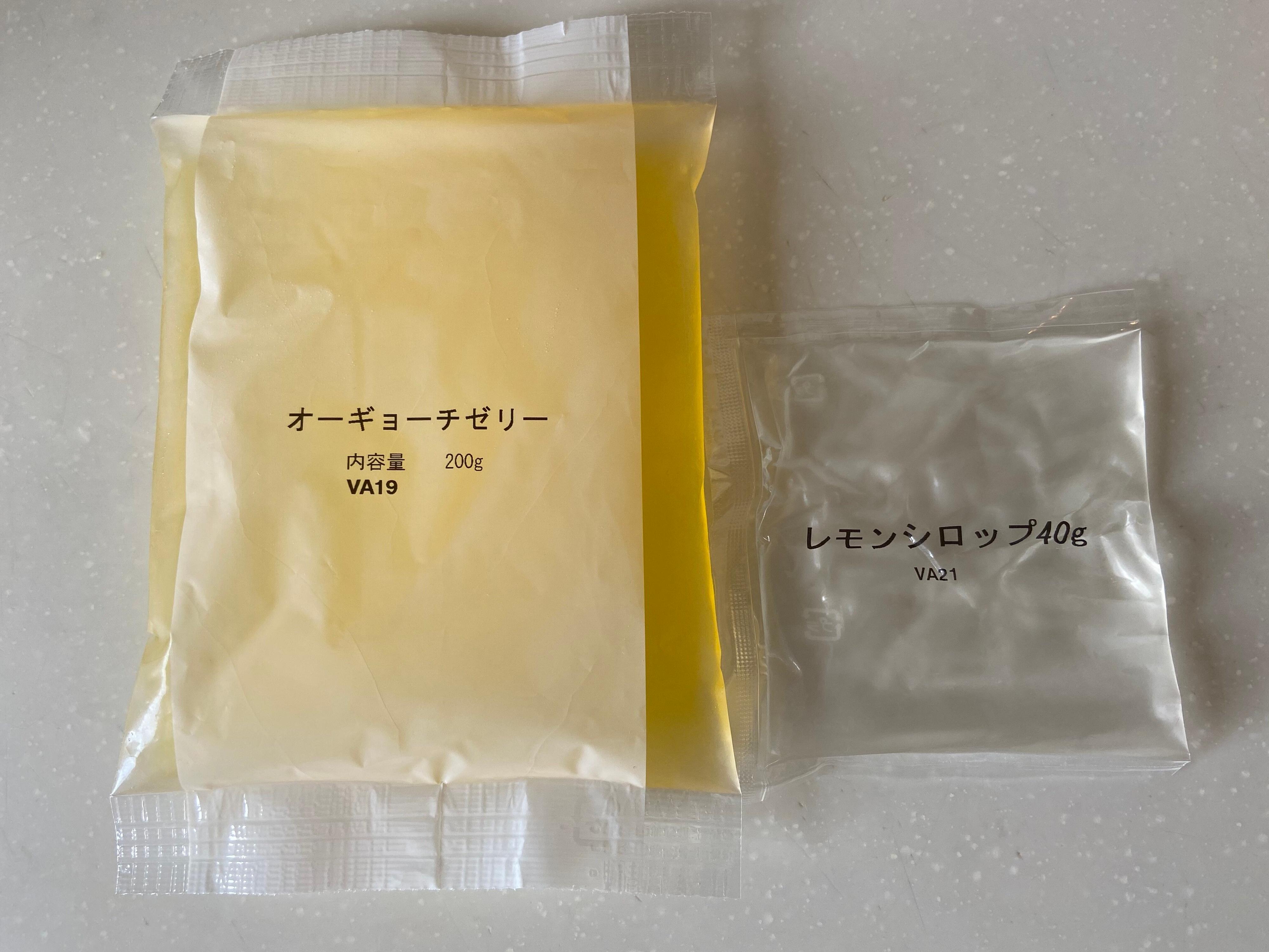中には黄色いオーギョーチゼリーが200g、透明のレモンシロップが40g入っています。