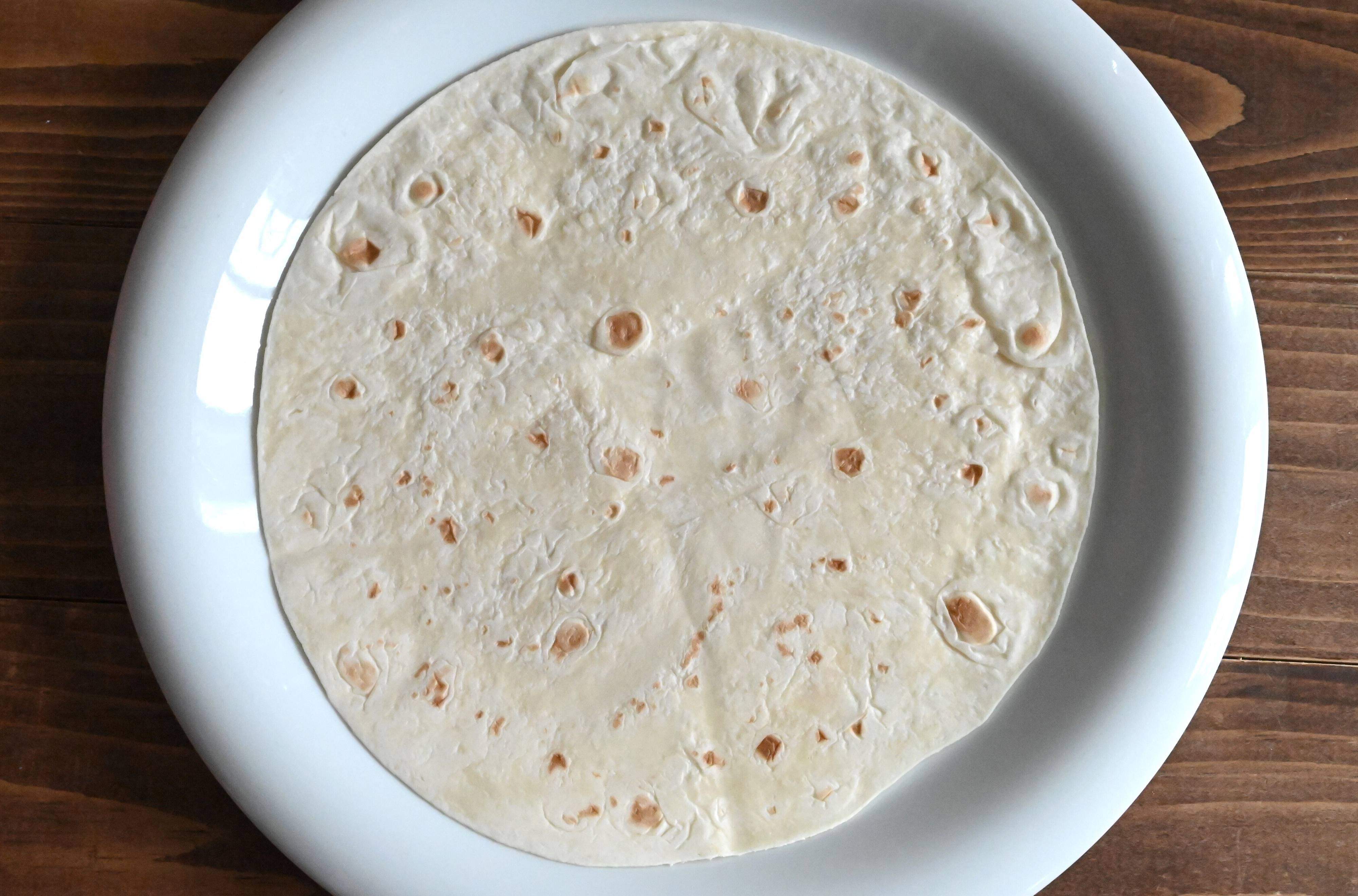 (1)トルティーヤ生地をフライパンで中火にかけ、両面に焼き色をつけて取り出す。