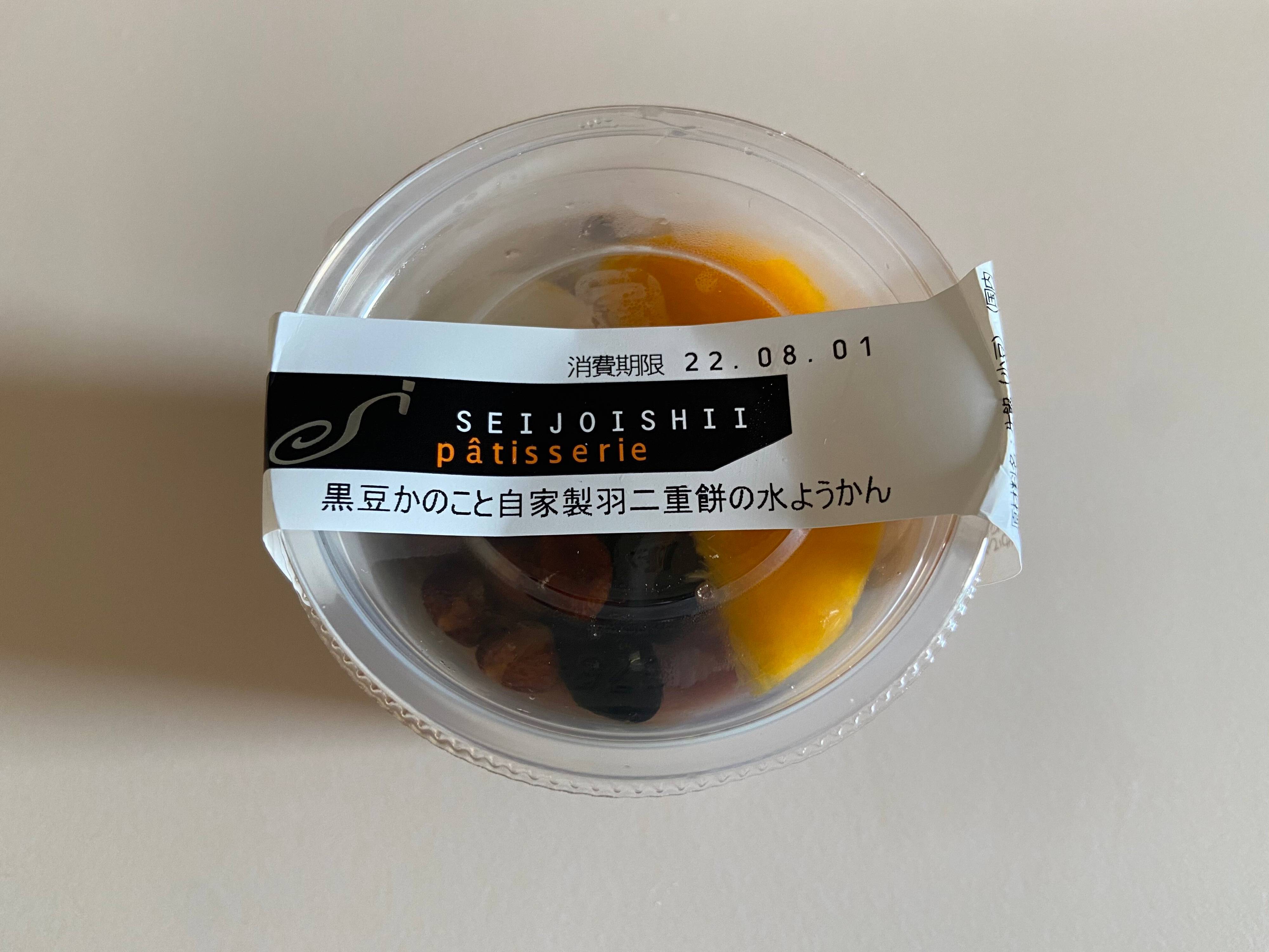 見た目も涼しげな夏にぴったりの和スイーツ「黒豆かのこと自家製羽二重餅の水ようかん」(購入時:280円)を購入してきました。