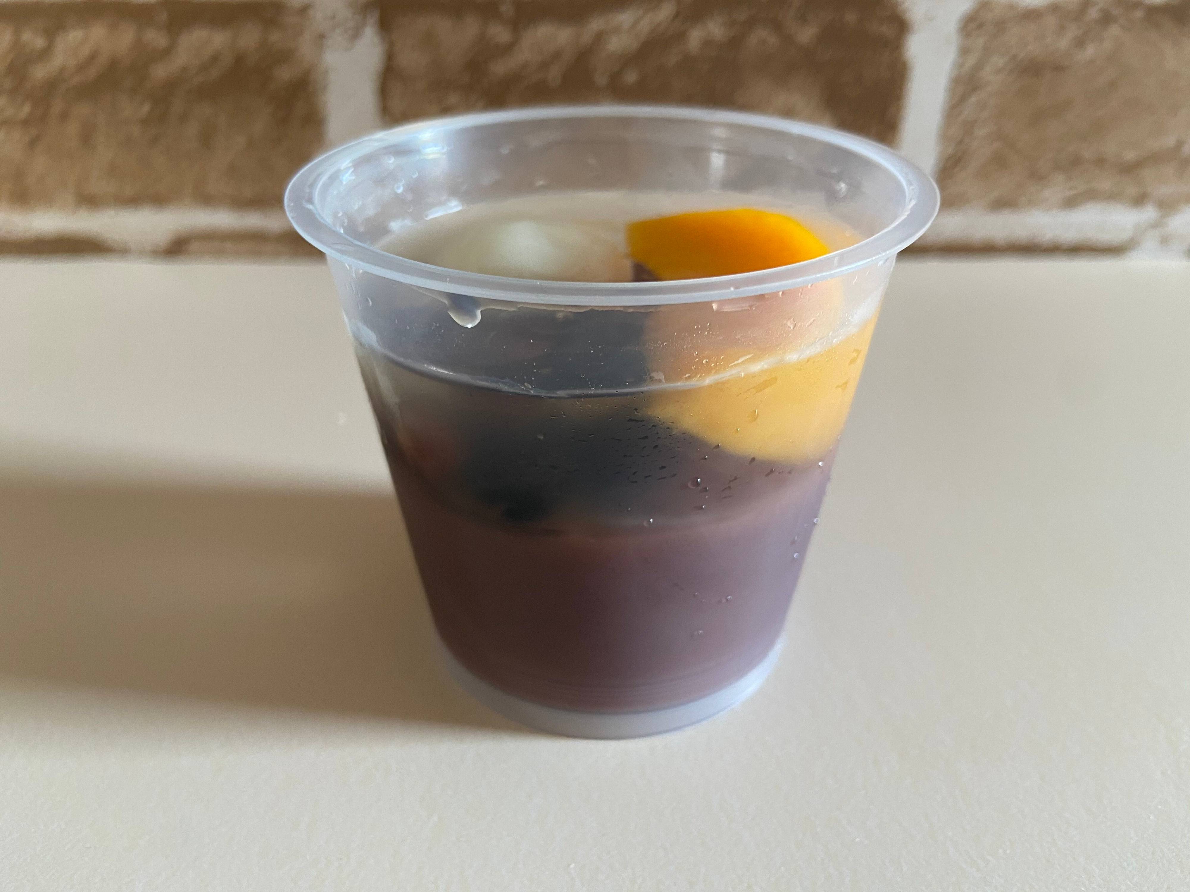 本葛を使用した水ようかんに黒豆かのこと赤えんどう豆、自家製の羽二重餅をトッピングした「和」のカップスイーツです。