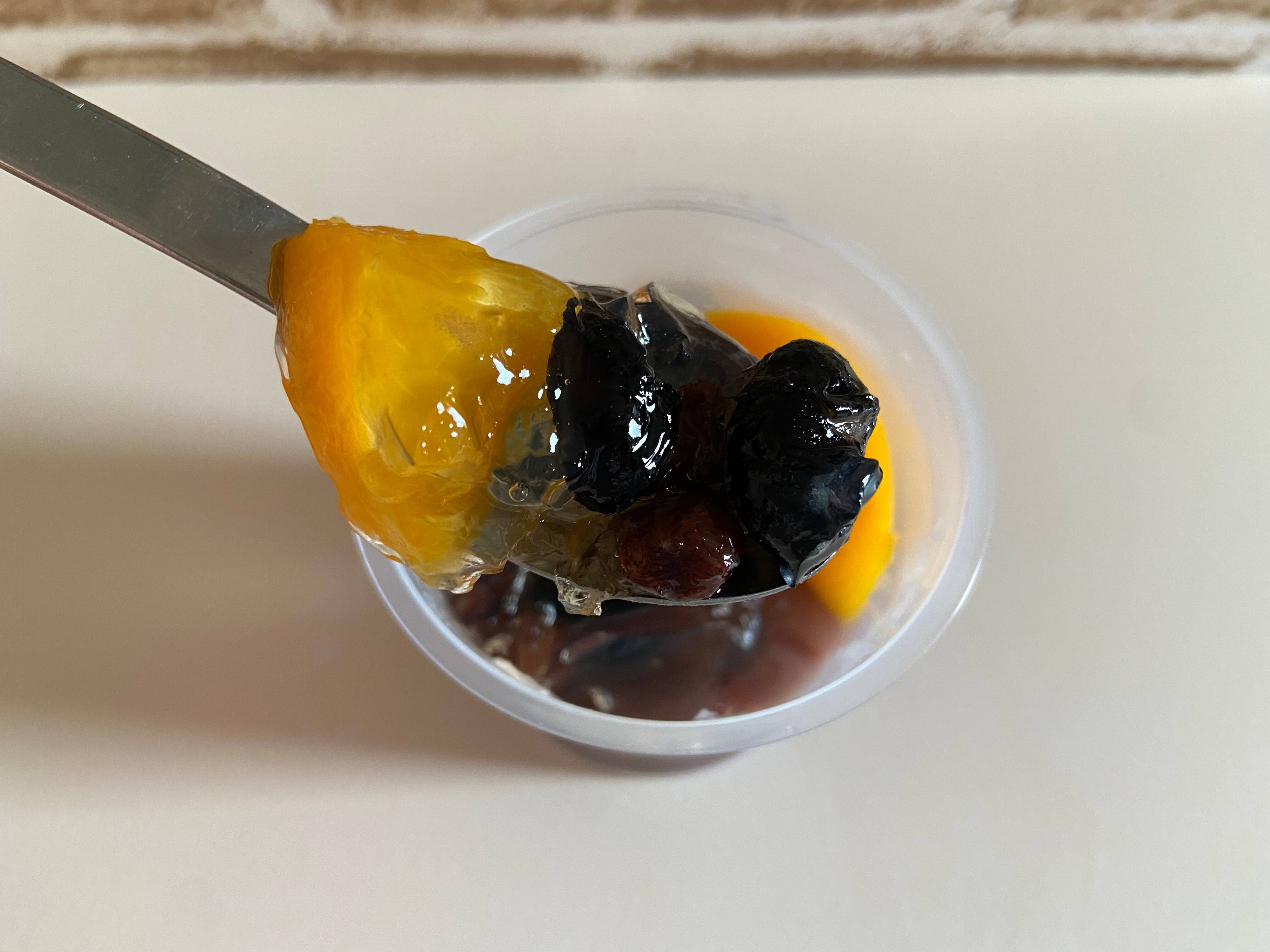 黒豆のコクのある甘みと赤えんどうのほっくり感がふるふるのジュレと意外にもよく合います。黄桃の甘酸っぱさが爽やかでおいしいですね。