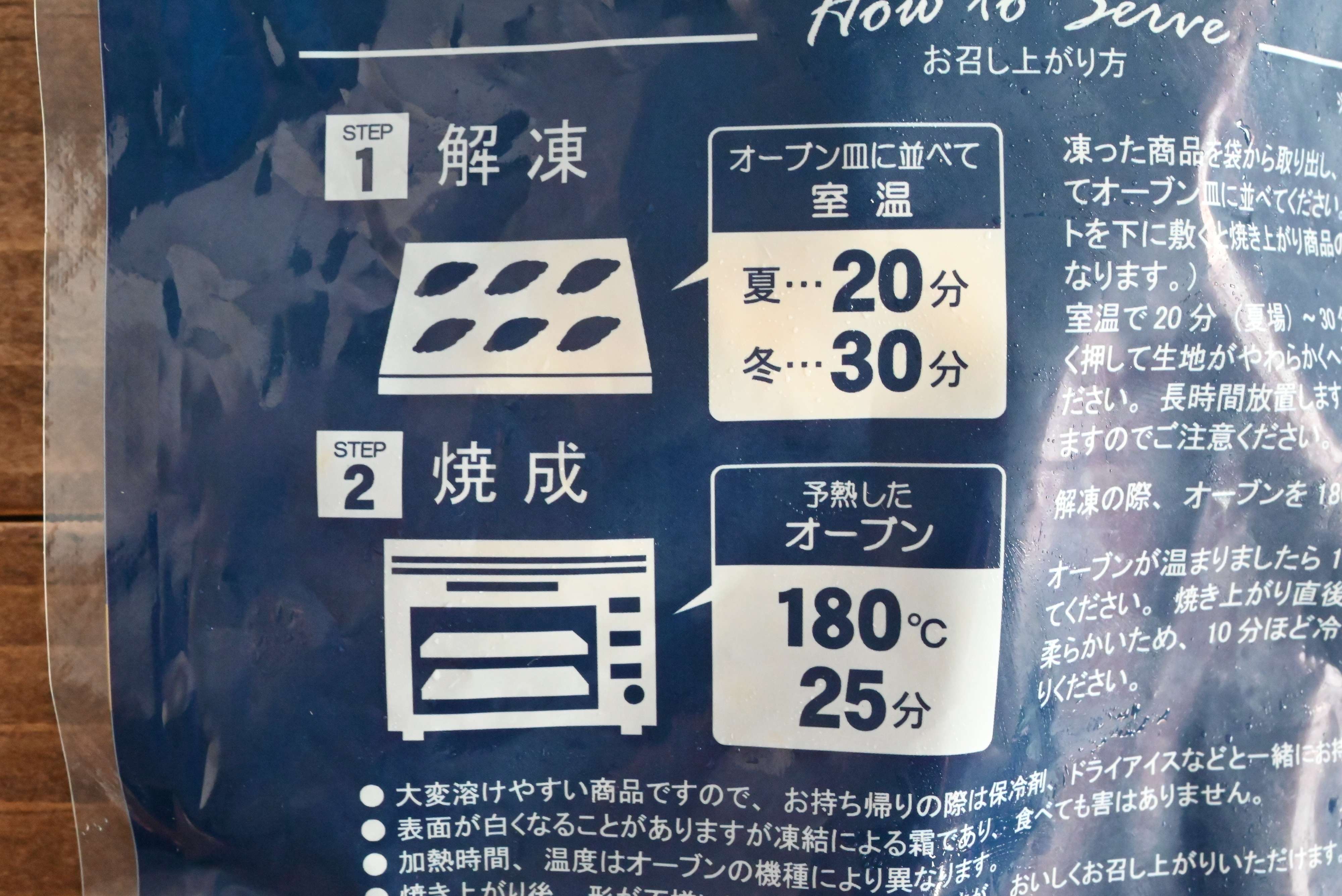 自宅で焼いて完成させる商品で、室温で20〜30分置き、180℃に予熱したオーブンで25分焼いて完成です。