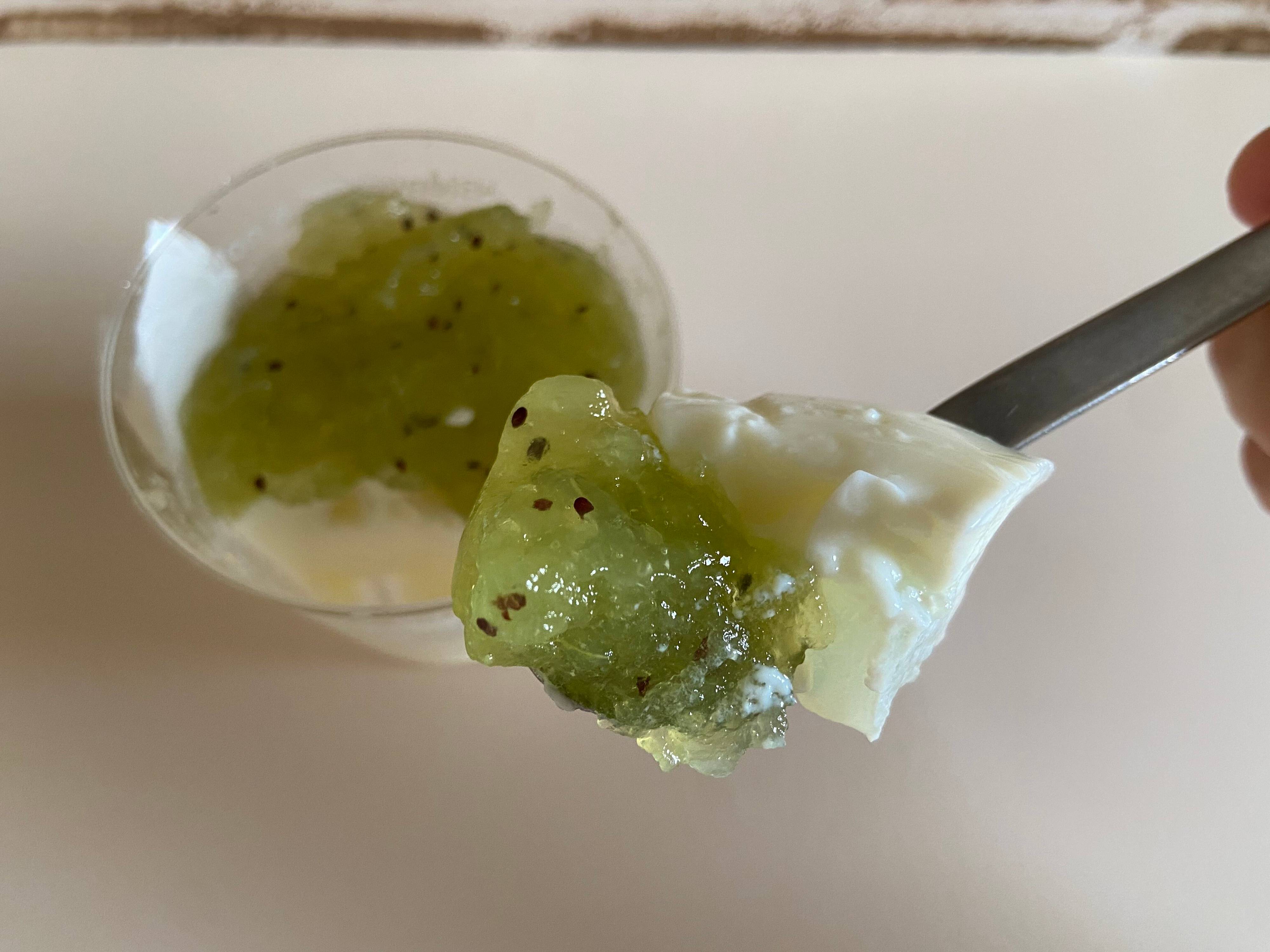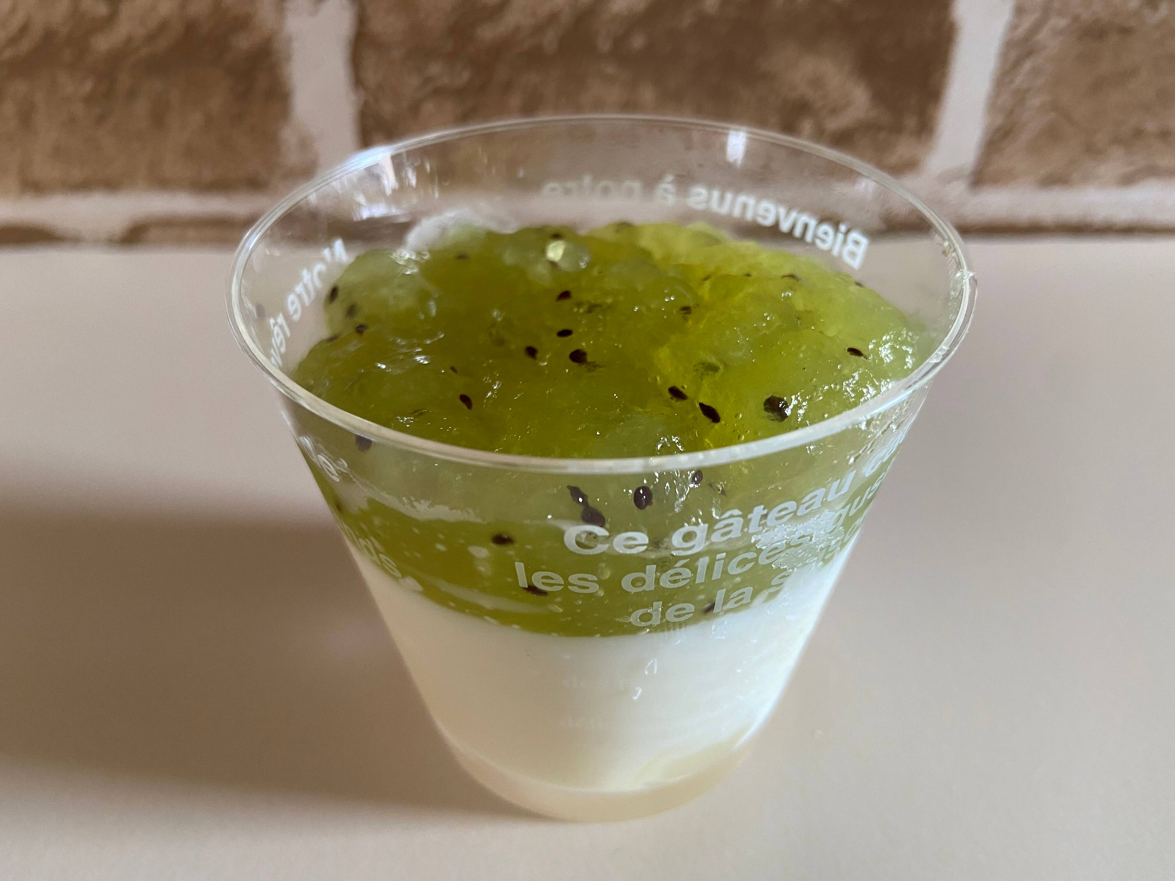 ありそうでなかった、キウイと杏仁豆腐の組み合わせ。そこにサプライズのナタデココも加わって、1カップで見た目も味もとっても楽しめるおいしいスイーツでした。