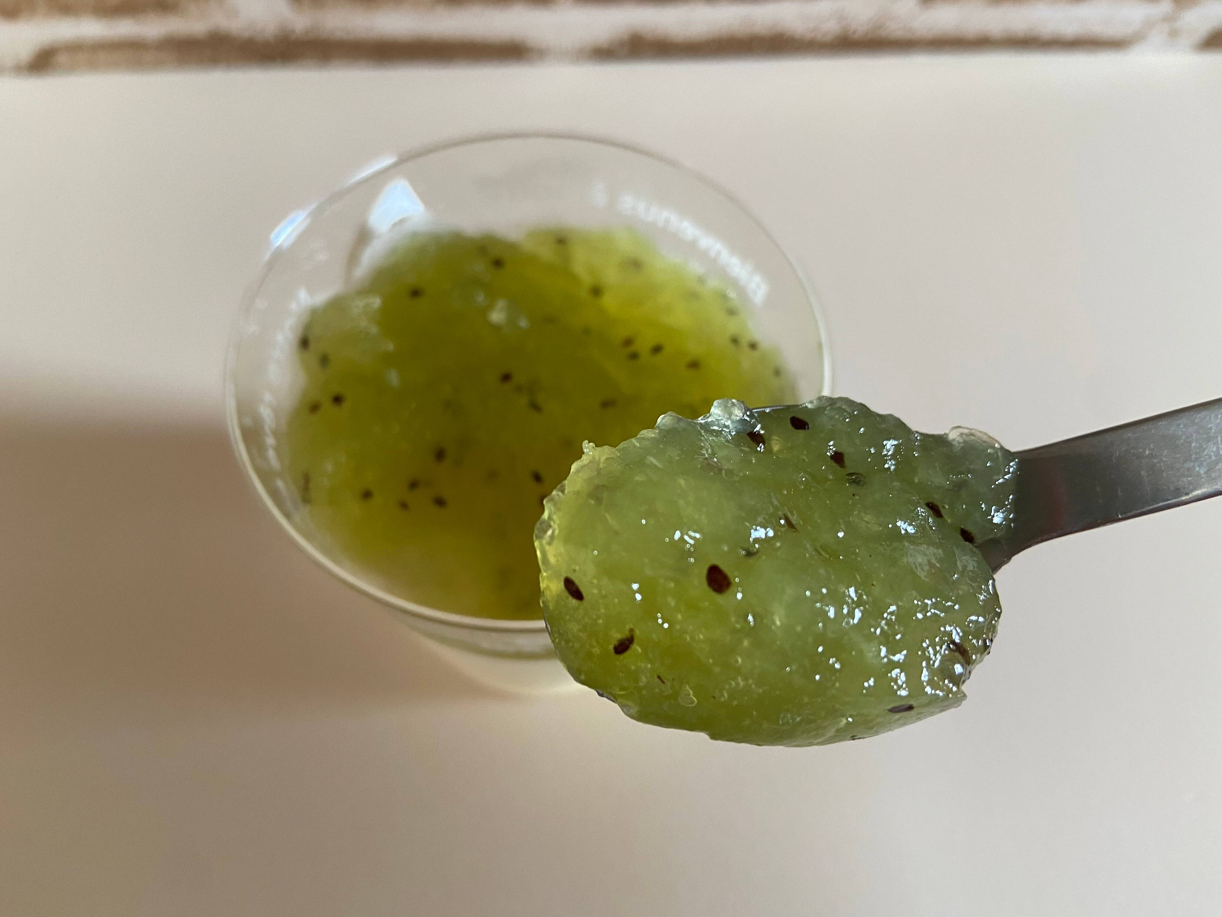 まずキウイジュレから食べてみると、キウイのフレッシュなおいしさがたっぷり詰まったおいしいジュレです。ほどよい酸味とぷるぷるの食感がとても心地いい!