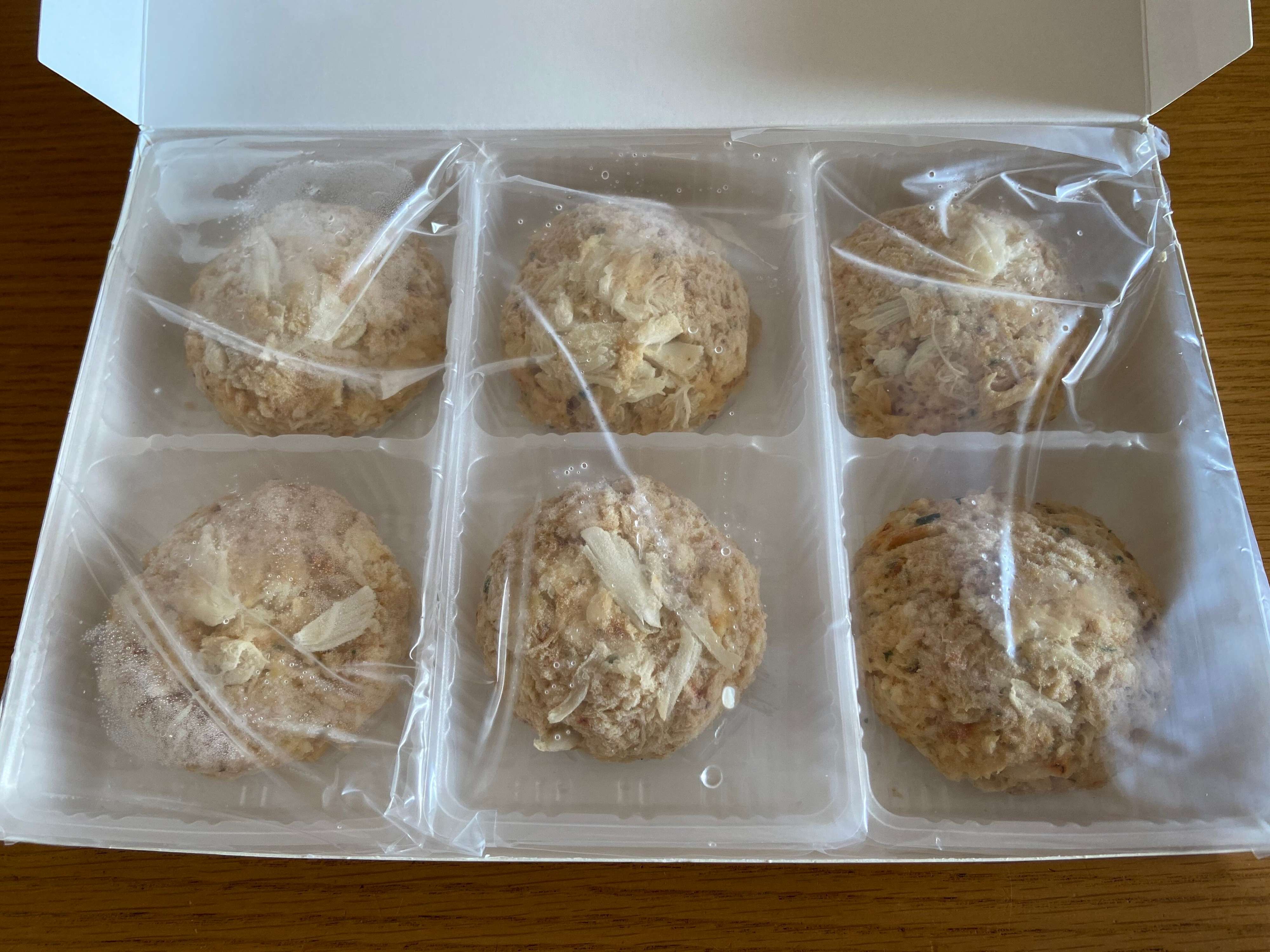箱を開けると中には6個入り。なんと全体量の65%が蟹とのこと。筆者はクラブケーキを食べたことがないので、蟹がたっぷりギュギュっと詰まった魅惑のケーキに調理前から期待が高まります。