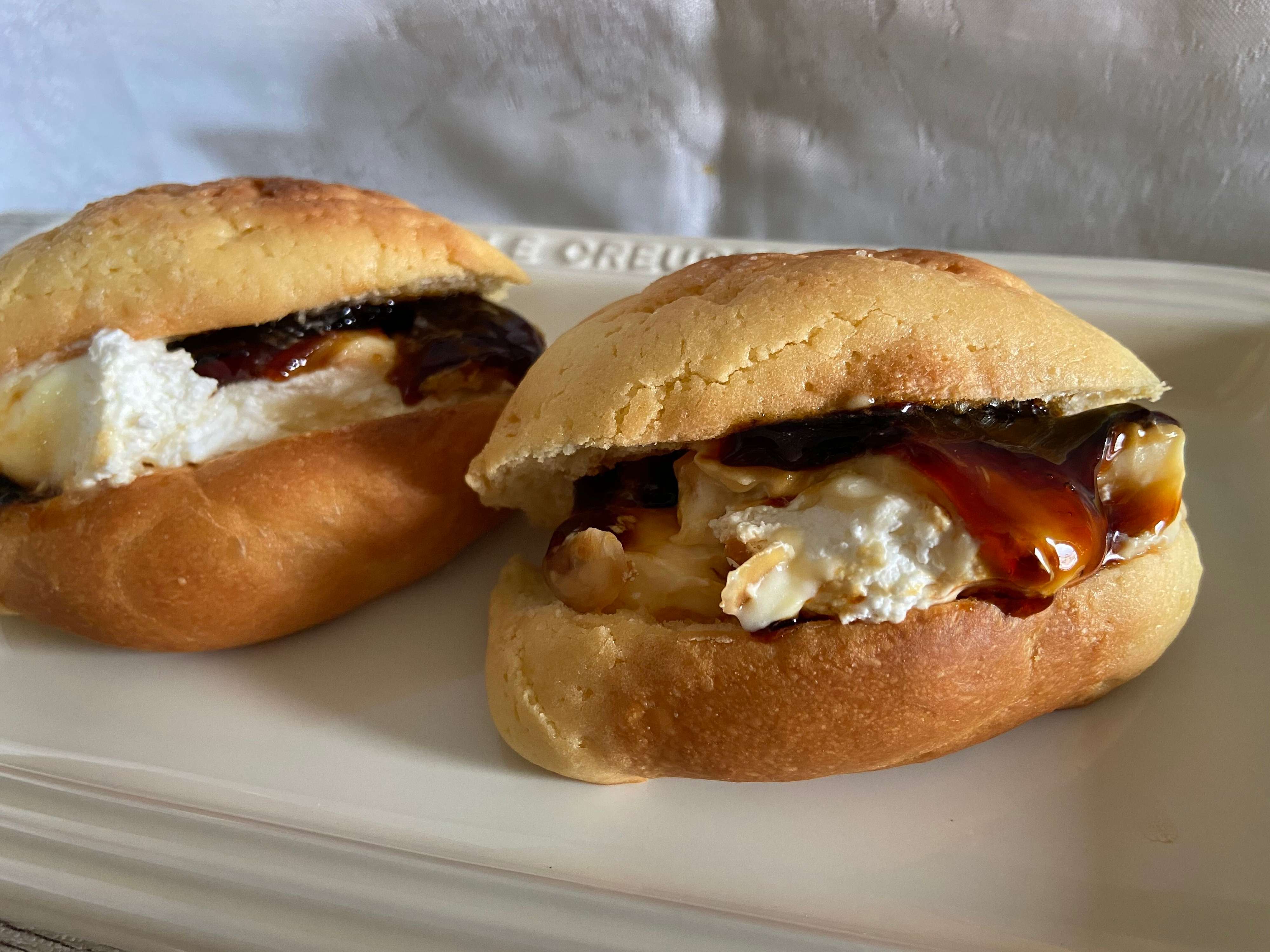 ミニサイズのメロンパンをトースターで軽く焼いて間にたっぷりプリンケーキをサンド!