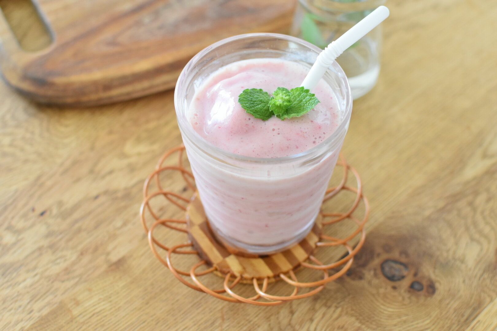 冷凍いちご、はちみつ、牛乳を一緒に合わせてミキサーにかけるだけ!量や甘さは好きに調整してみてくださいね。